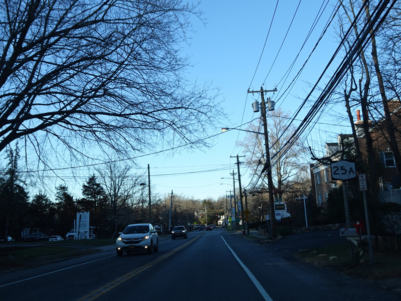 Main Street ends here at a traffic light at Saint Johnland Road. Turn right to stay on NY 25A.