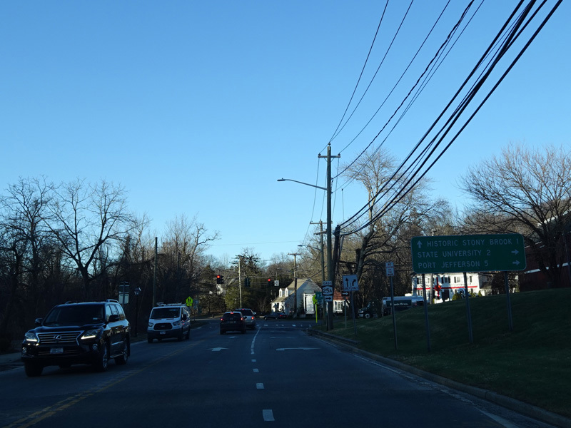 NY 25A runs southeast from Port Jefferson to Port Jefferson Station as a two-lane undivided road.