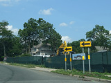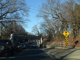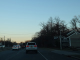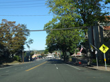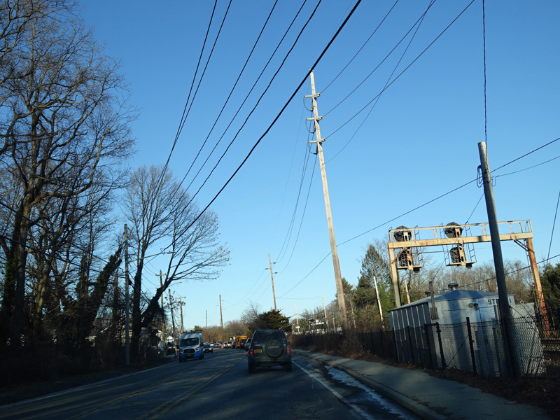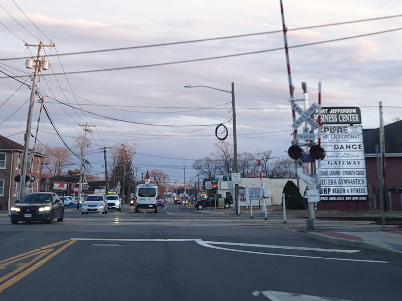 There is a railroad crossing at the Port Jefferson Branch of the Long Island Rail Road, which ends just east of here.