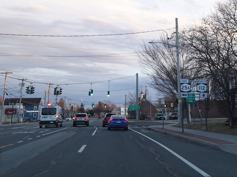 Turn left at this traffic light to stay on NY 25A. Continue straight ahead to go south on NY 112, which begins here.
