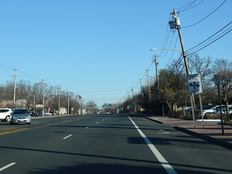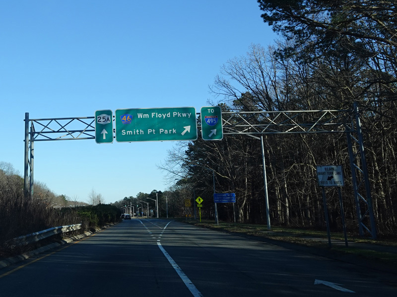There is a grass median as the William Floyd Parkway (CR 46) begins on the right at a traffic light.