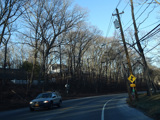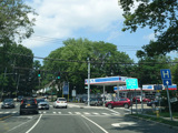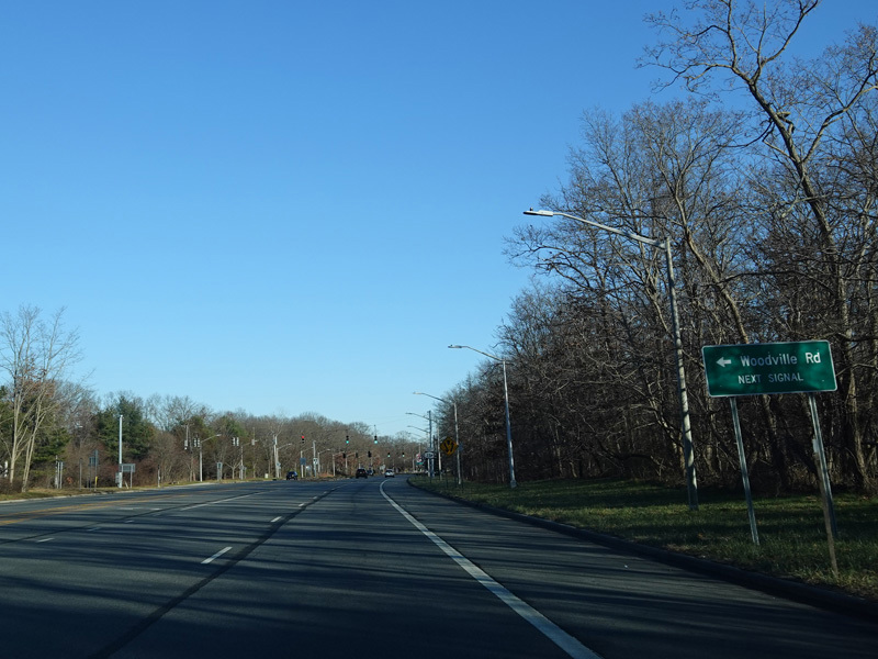 NY 25A runs east as a four-lane undivided road. There is a traffic light at Woodville Road.