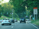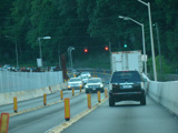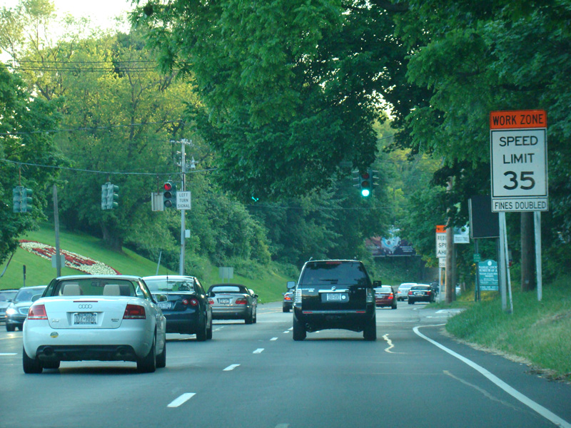 These photos show the Roslyn Viaduct during its reconstruction, which lasted from 2006 until 2011. Temporary signs were posted along the section of Northern Boulevard before the viaduct to advise motorists of the work zone ahead. There were only three lanes on the viaduct during the reconstruction. The middle lane was reversible to accommodate traffic flow. Temporary traffic lights overhead indicated which lane or lanes to use for each direction.