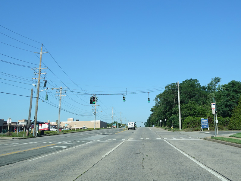 There is a traffic light at Lakeville Road (CR 11). Turn right to go north or left to go south. The Queens-Nassau county line passes through this intersection. Union Turnpike continues straight ahead into Queens. At this intersection of three routes systems (New York State, New York City, and Nassau County), the traffic light is provided by the Nassau County Department of Public Works.