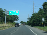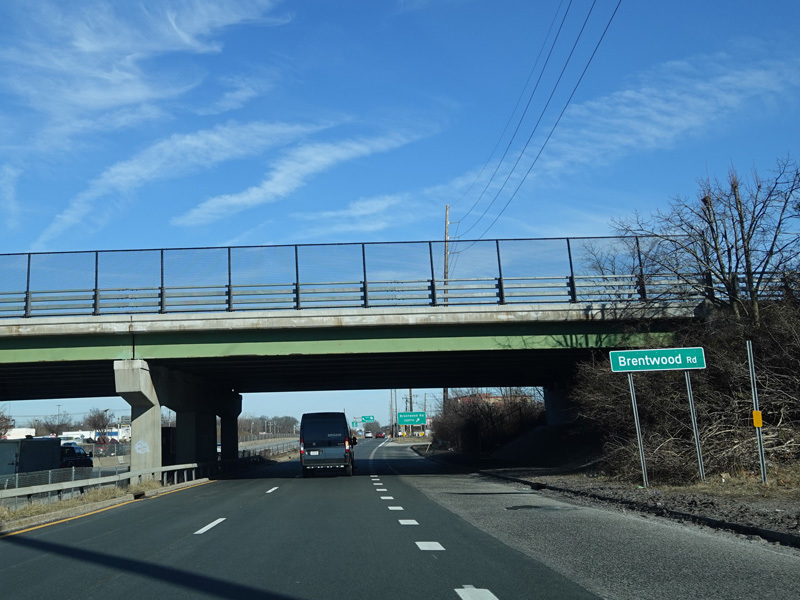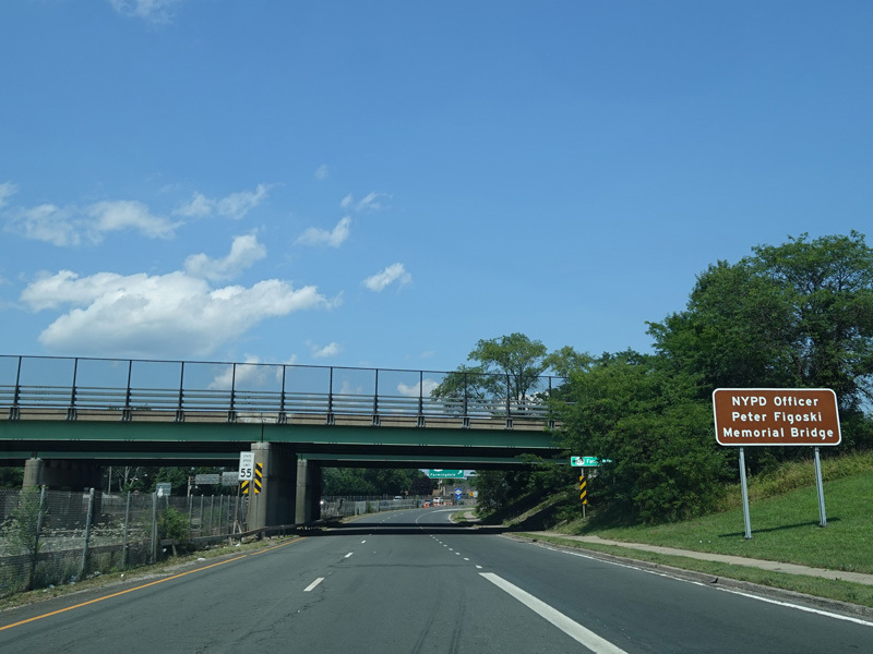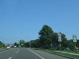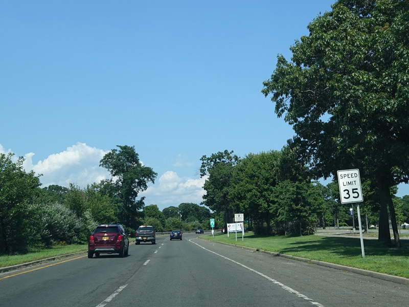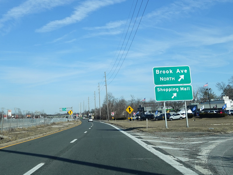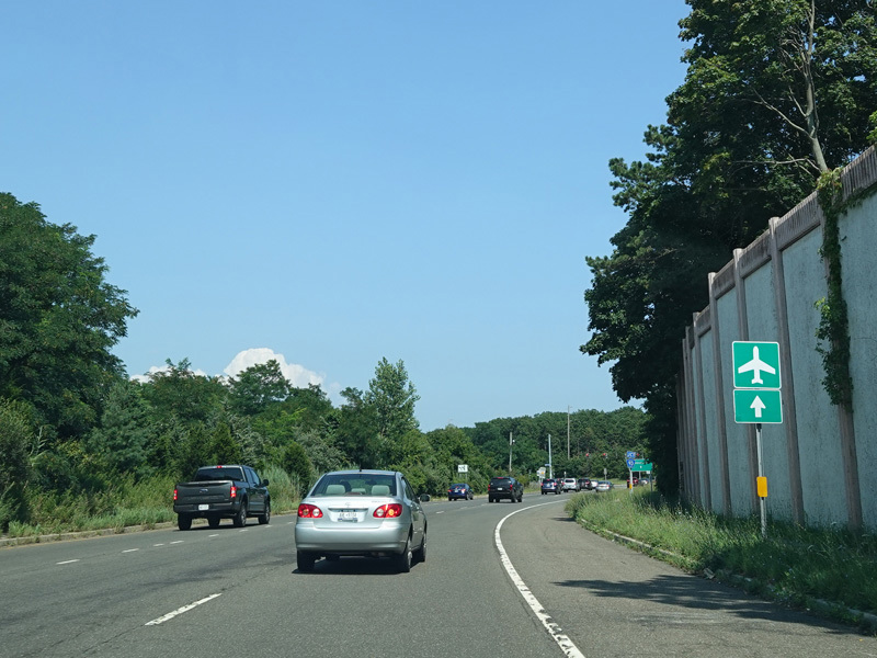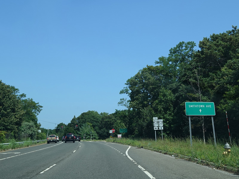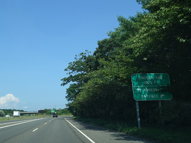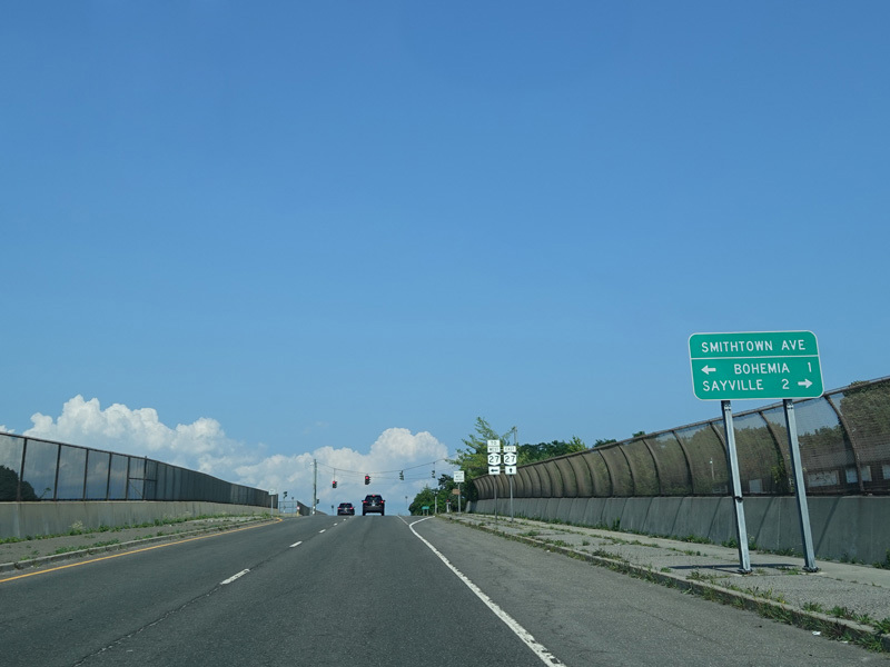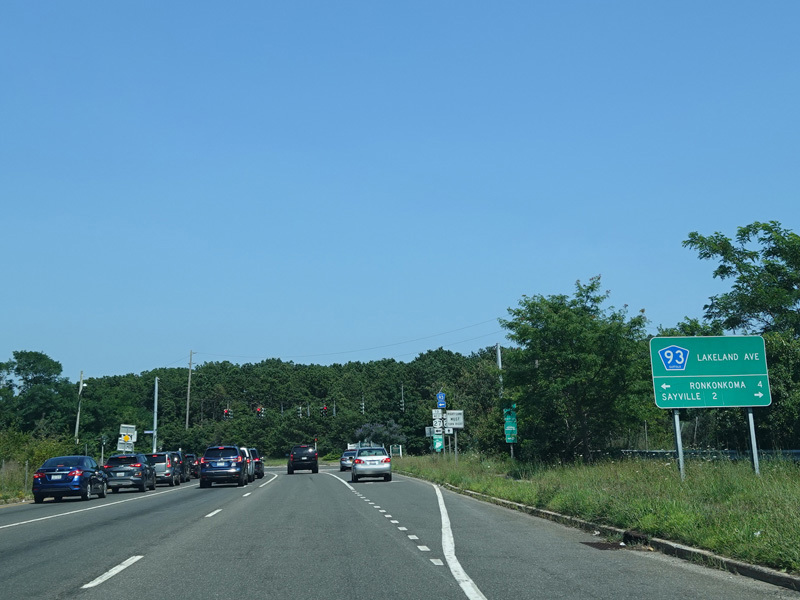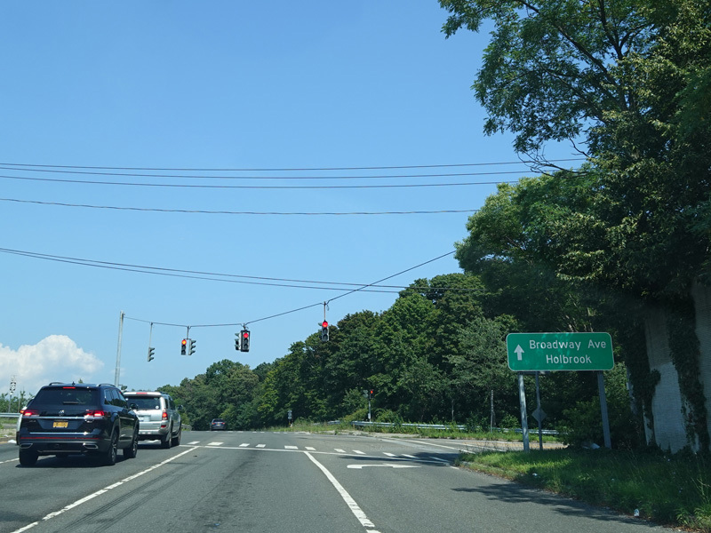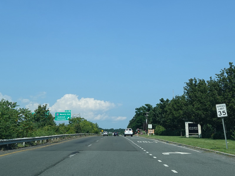 The service roads narrows down to a single lane again, and Veterans Highway (NY 454) merges in on the left.