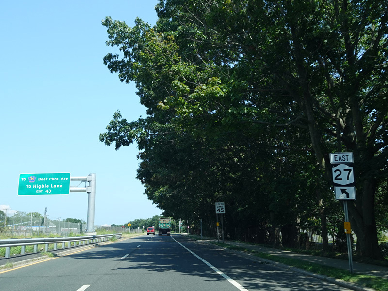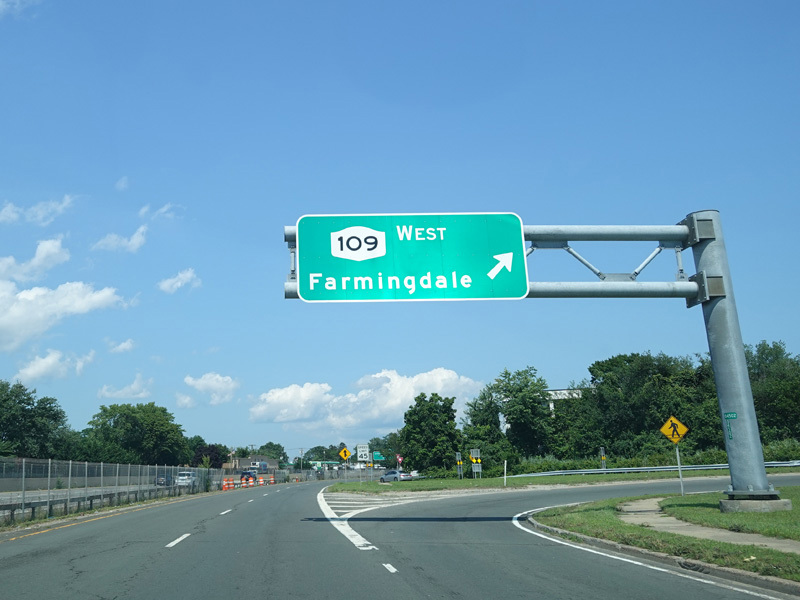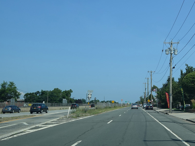 The service road begins as Sunrise Highway becomes an expressway in West Babylon. There is a pair of exits for Babylon-Farmingdale Road (NY 109).