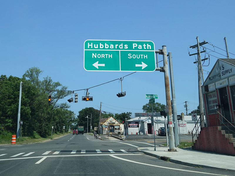 There is a traffic light at Hubbards Path. Turn left to go north or right to go south.