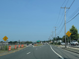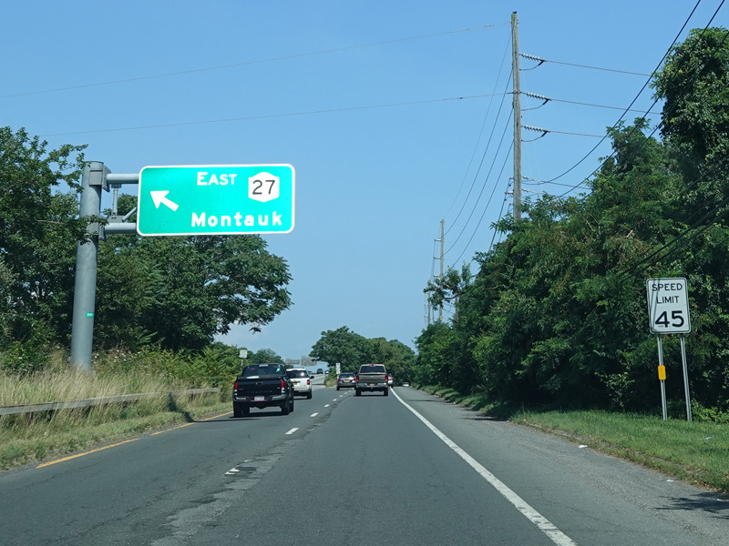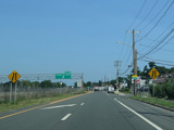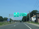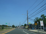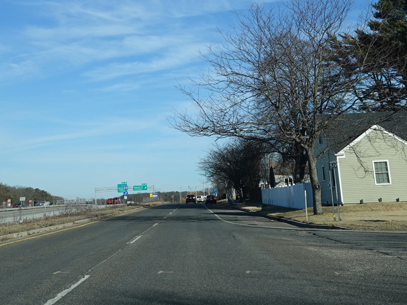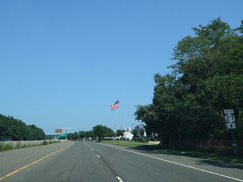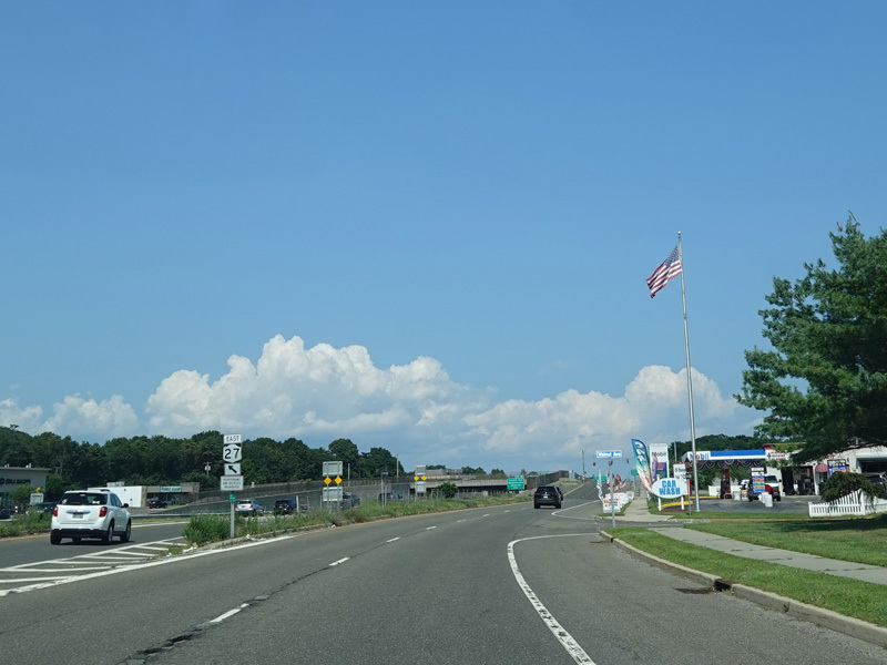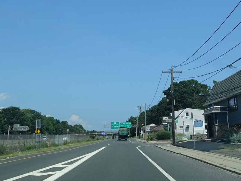 The service road begins again in Oakdale as the ramp from exit 47 merges with a lane for Montauk Highway (CR 85).