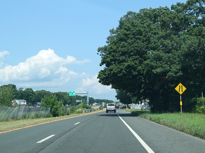 The service road narrows down to a single lane, and a second lane merges in on the left from exit 41.