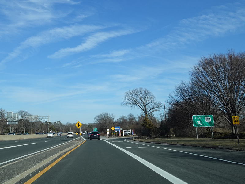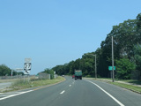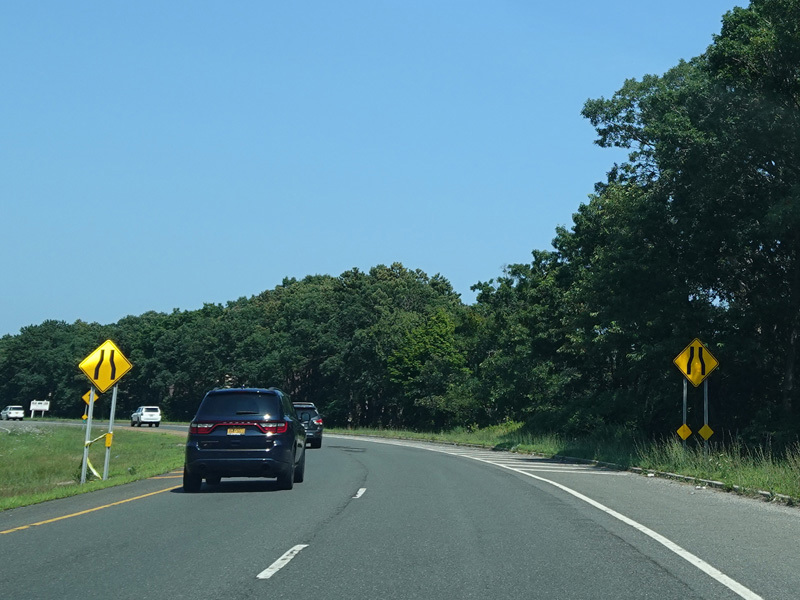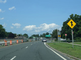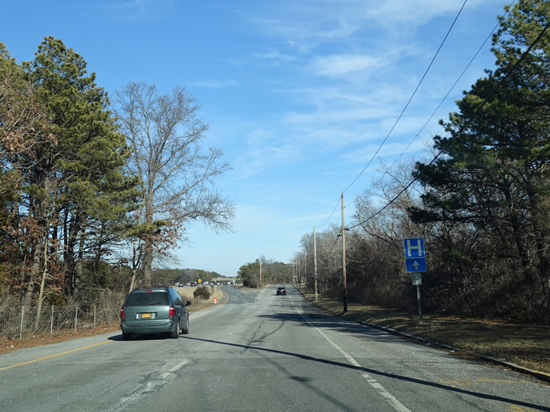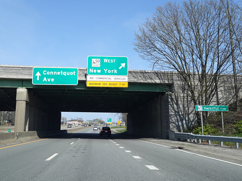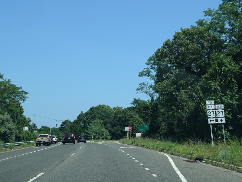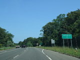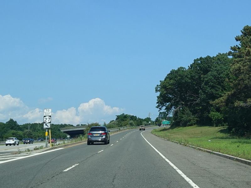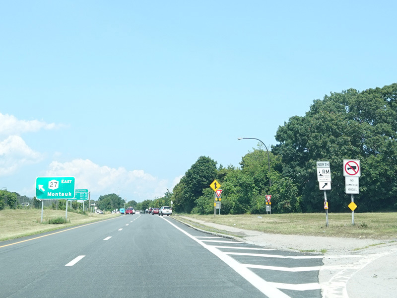 There is a service road gap as Sunrise Highway passes through Connetquot State Park. Bear left to get on the highway or right for access to Wheeler Road.