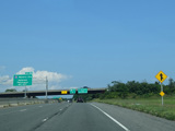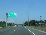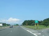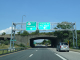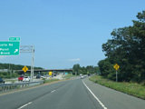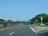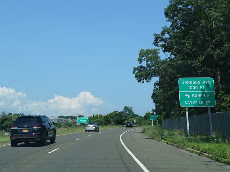There is an exit on the right for Higbie Lane, followed by an entrance to Sunrise Highway on the left.