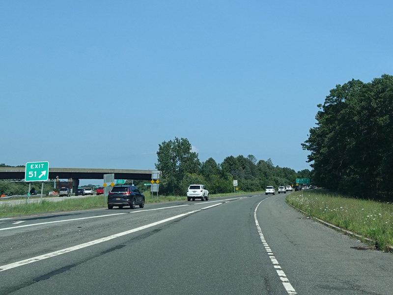 The service road narrows down to a single lane, and a second lane merges in on the left from exit 51.