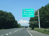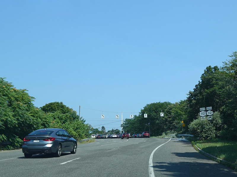 There is a traffic light at NY 112. Turn left to go north or right to go south.
