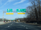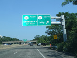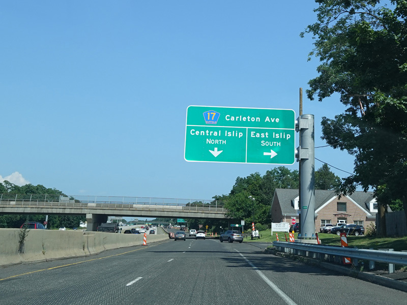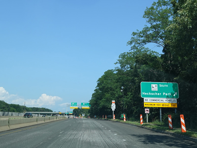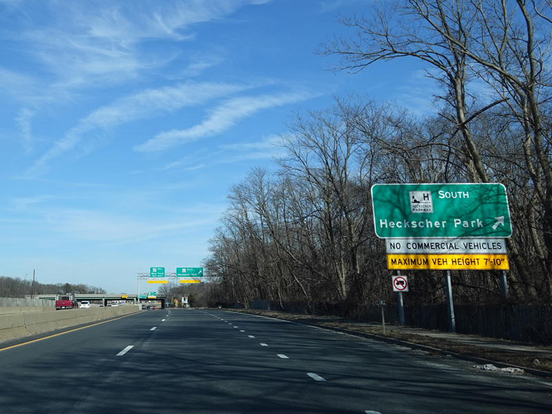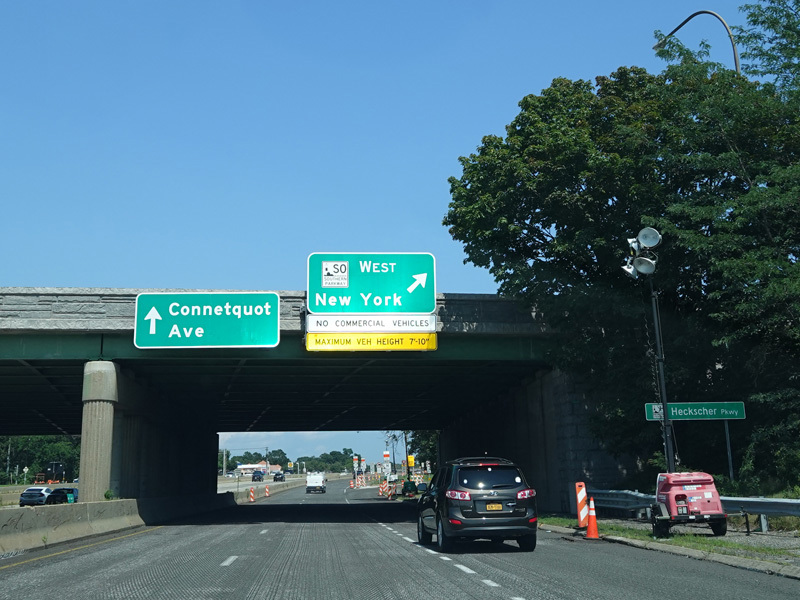 These signs were found on the service road of Sunrise Highway at its interchange with the Southern Parkway. They have all been replaced. The new signage uses brown signs for the direction toward Heckscher State Park.
