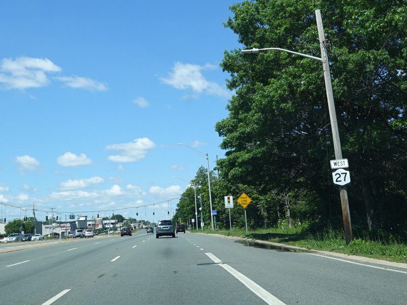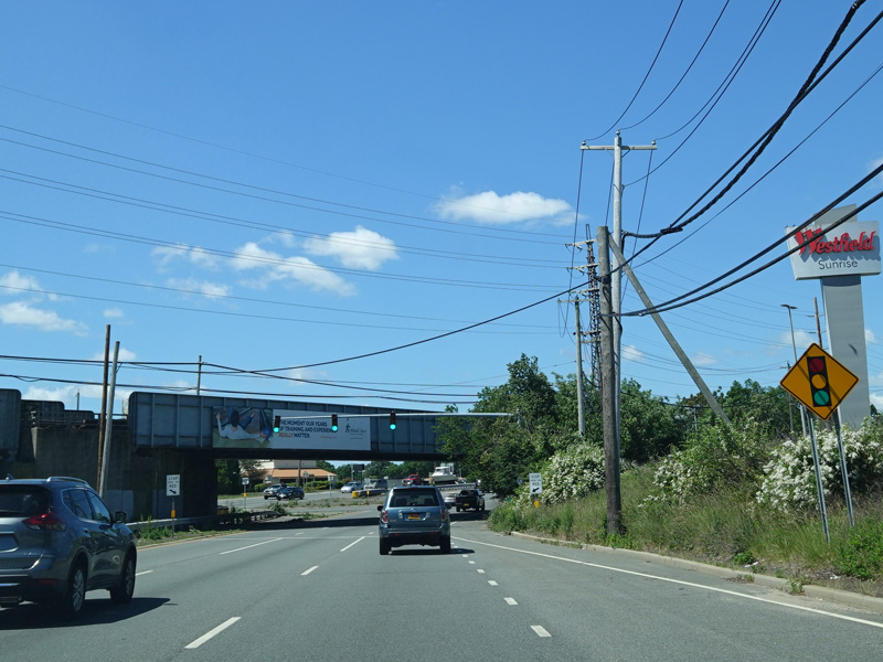 Sunrise Highway passes under the Babylon Branch of the Long Island Rail Road. Immediately thereafter, NY 27A merges in from the left. There is no access to it when travelling in this direction.