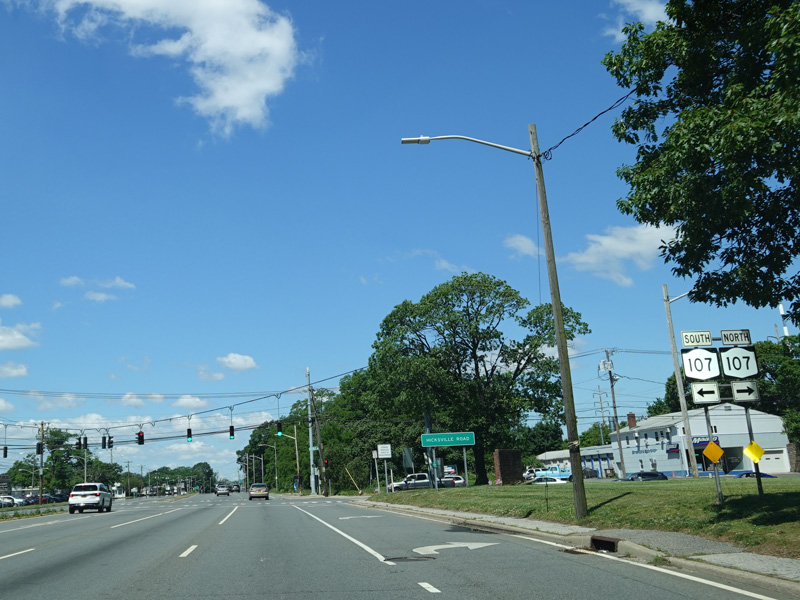 There is a traffic light at Hicksville Road (NY 107). Turn right to go north or left to go south.