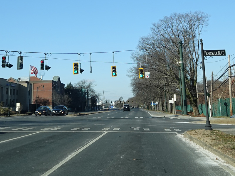 There is a traffic light at Peninsula Boulevard (CR 2).