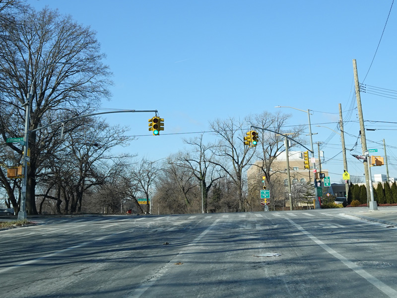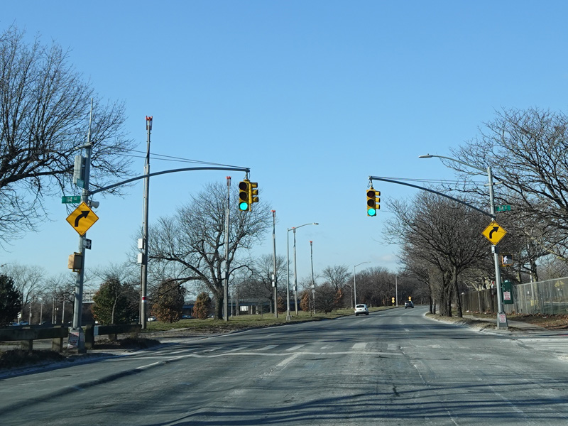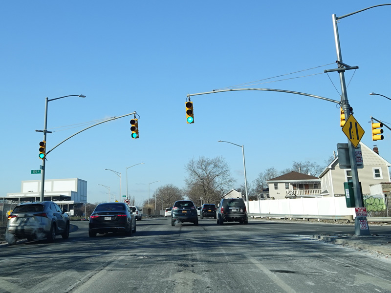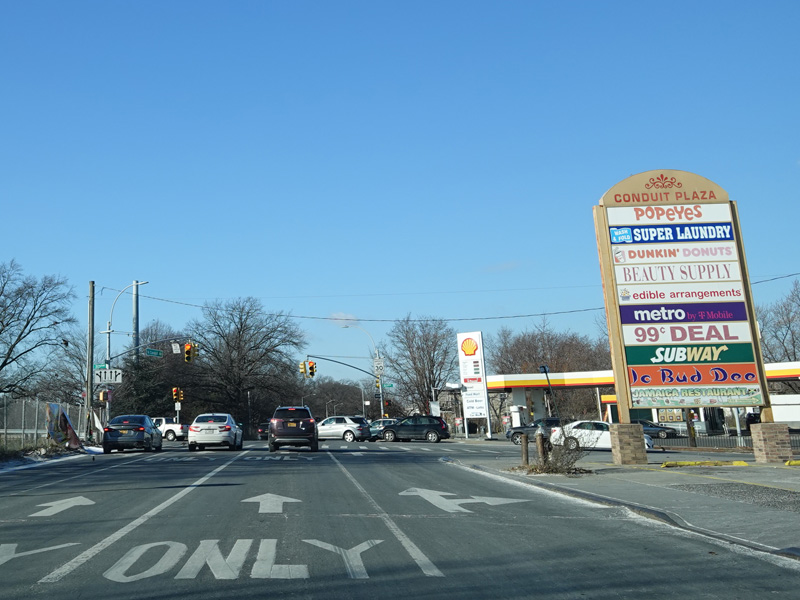 North Conduit Avenue runs west as the service road to the Belt Parkway. There is a traffic light with an oversized street name sign at 225 Street.