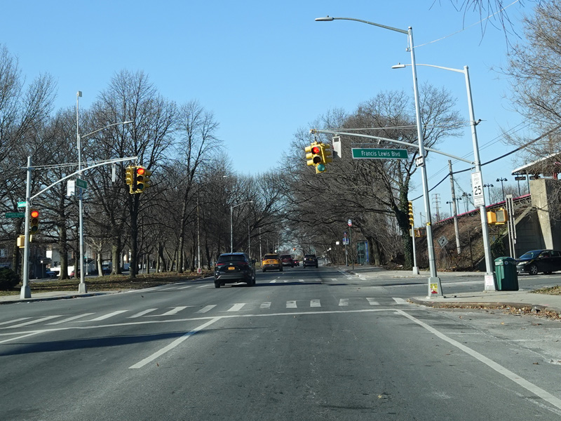 Welcome to Queens! Sunrise Highway continues a short distance into the borough. There are traffic lights with oversized street name signs at Hook Creek Boulevard and Francis Lewis Boulevard.