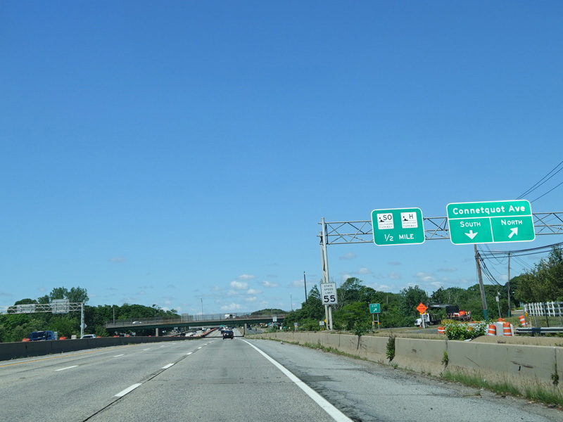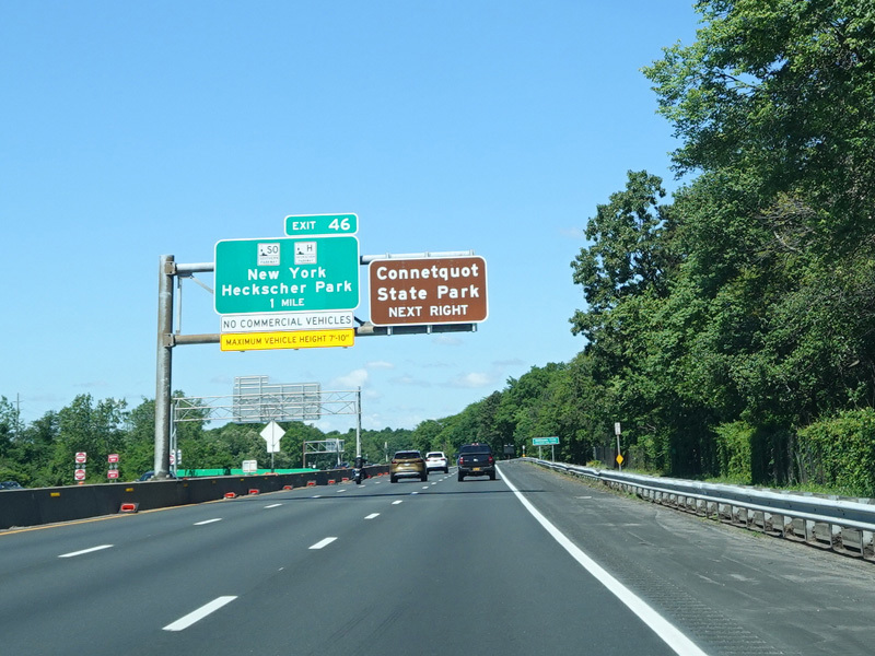 There is an unnumbered exit for Connetquot State Park. Exit 46 is for the Southern Parkway. It also provides access to Connetquot Avenue and Carleton Avenue (CR 17).