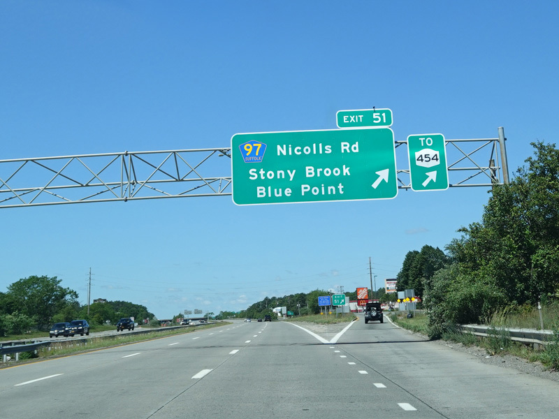 Exit 51 is for Nicolls Road (CR 97). It also provides access to Veterans Highway (NY 454) and Broadway Avenue.