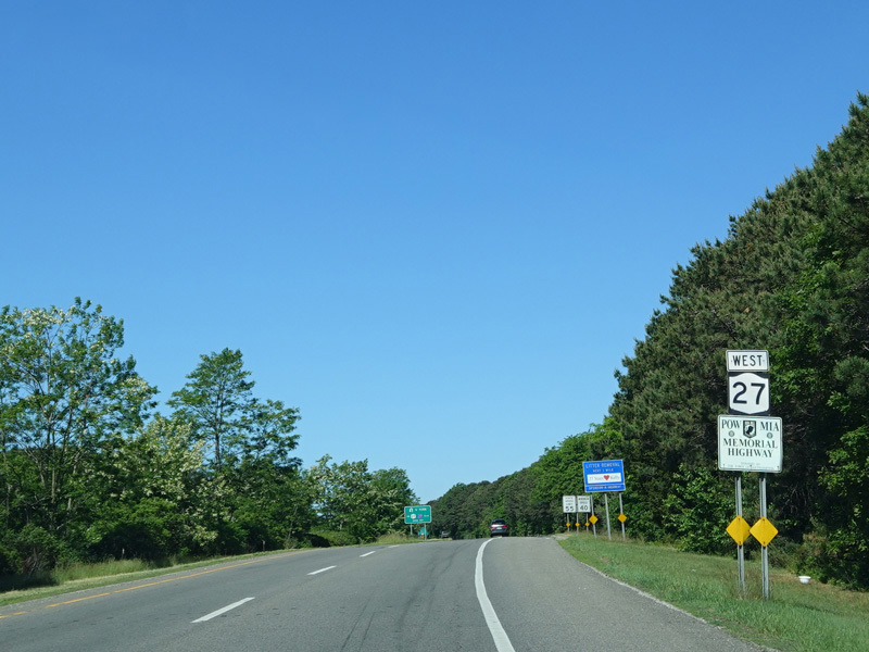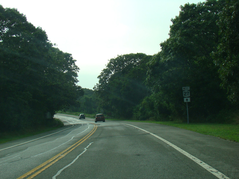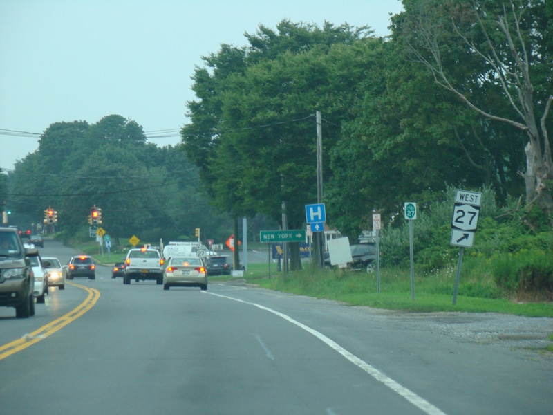Montauk Highway has a gap for a few miles. Hampton Road is straight ahead at this traffic light. Montauk Highway begins again a few miles west of here as the unsigned section of NY 27A. To stay on NY 27, turn right onto Flying Point Road (CR 39A).