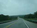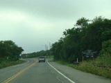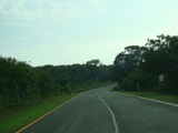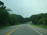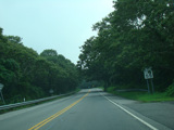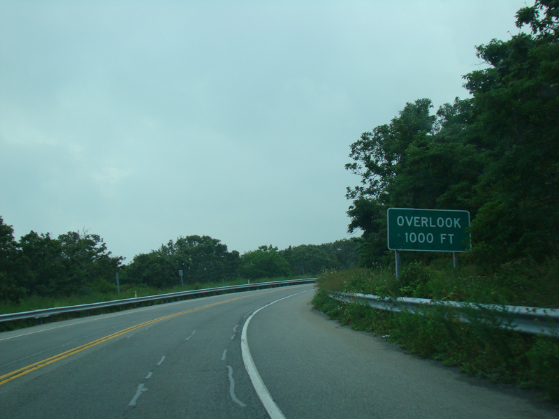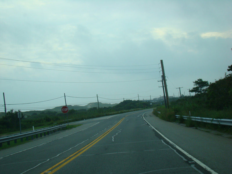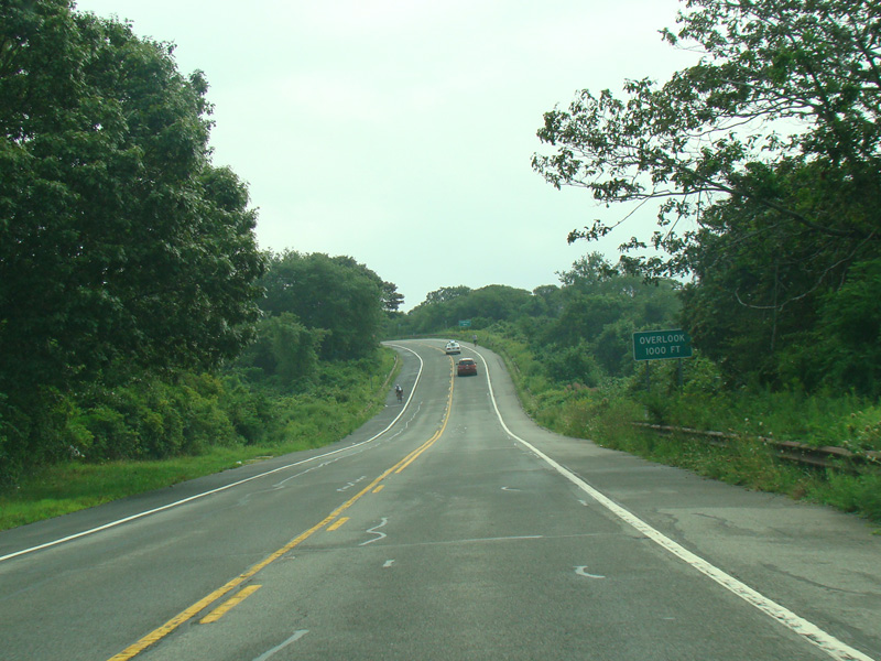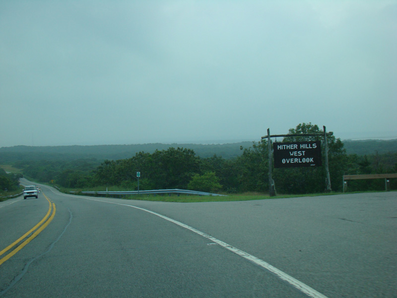 Montauk Highway runs east through Hither Hills State Park. There is a scenic overlook to the right.
