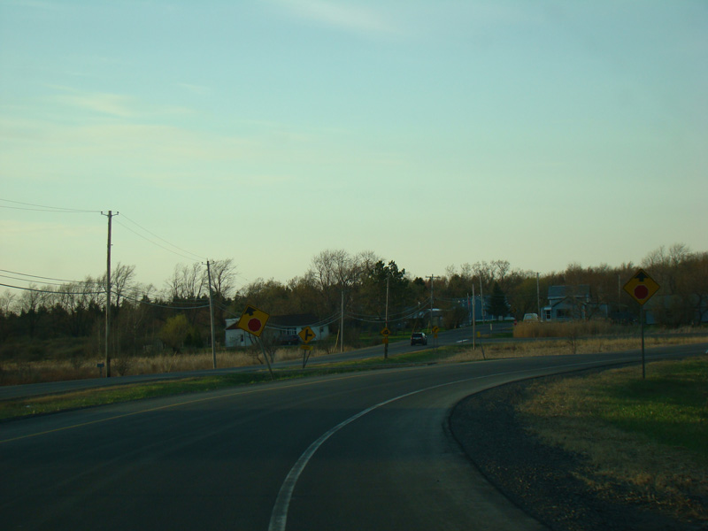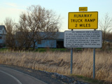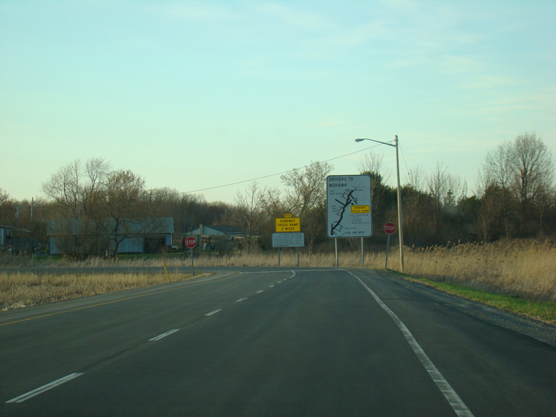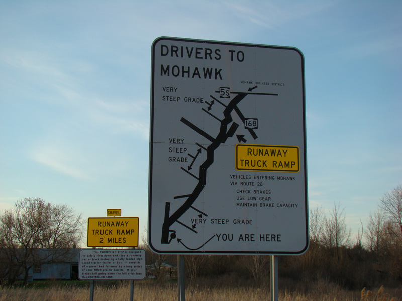 These pictures show the brake check area on northbound NY 28 just past Dennison Corners. There is a large sign with a map of the area ahead, followed by a smaller sign explaining what the runaway truck ramp is for.