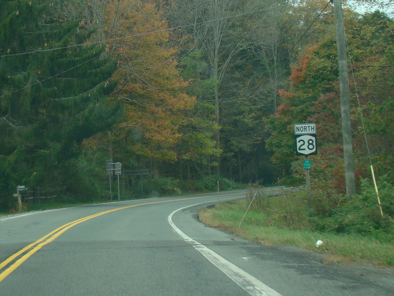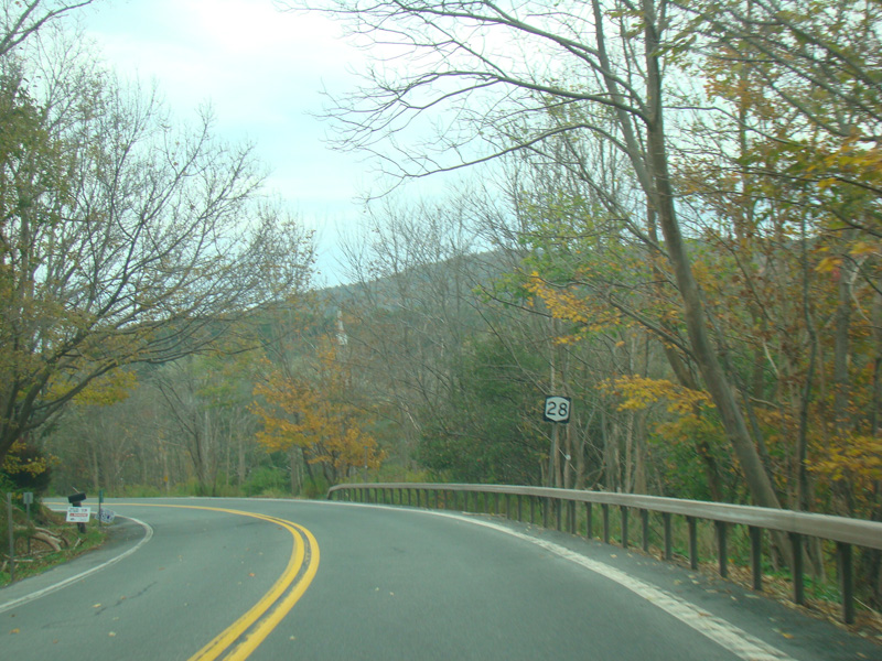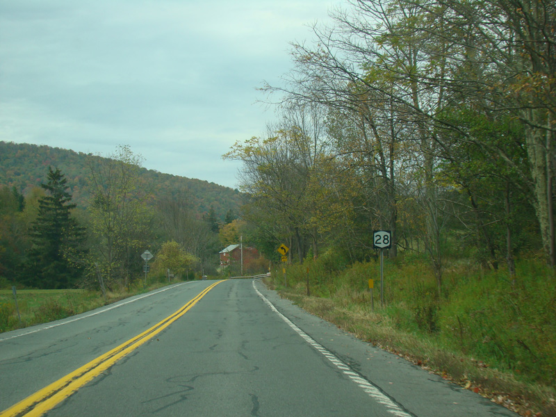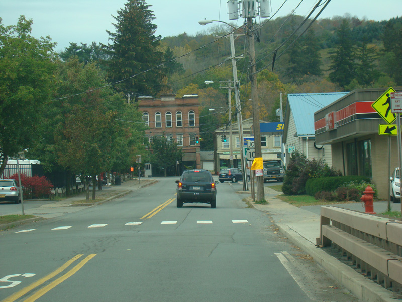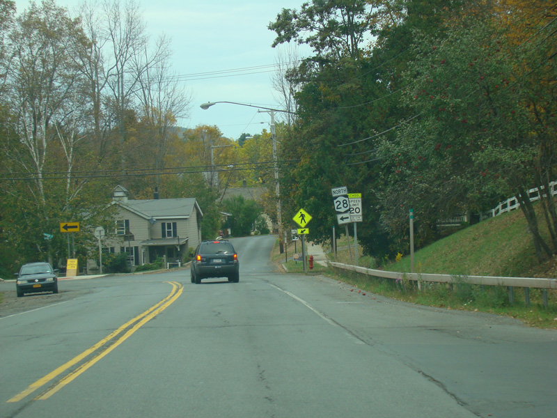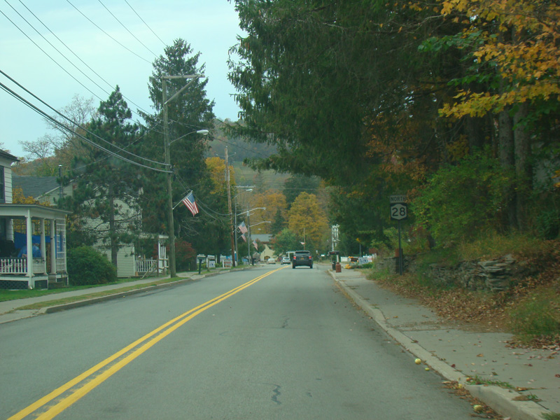 On the other side of the bridge, Kingston Street ends at Main Street (NY 10). Turn right to go north and to stay on NY 28. Turn left to go south.