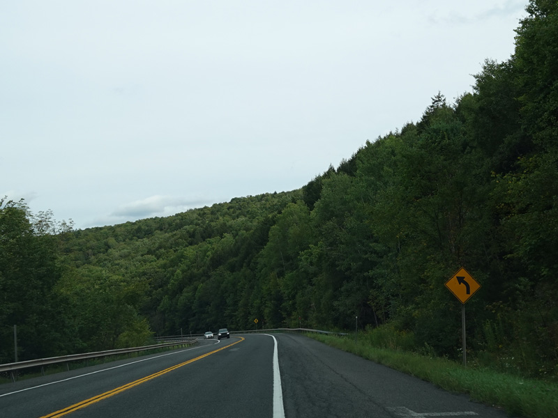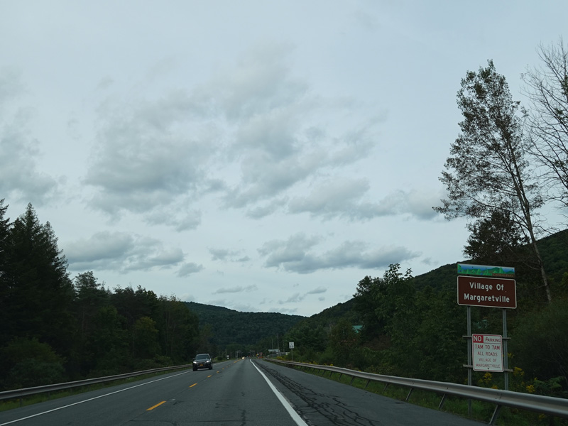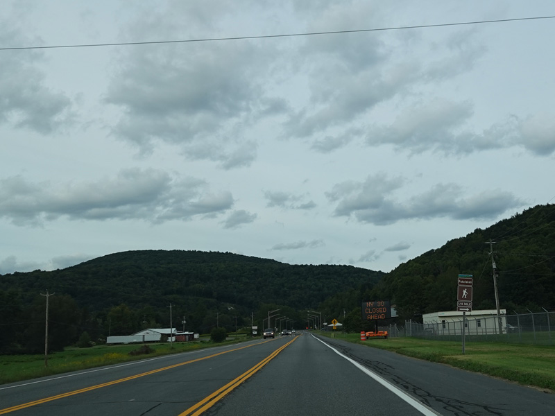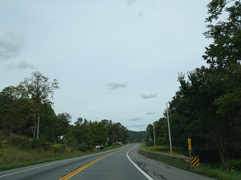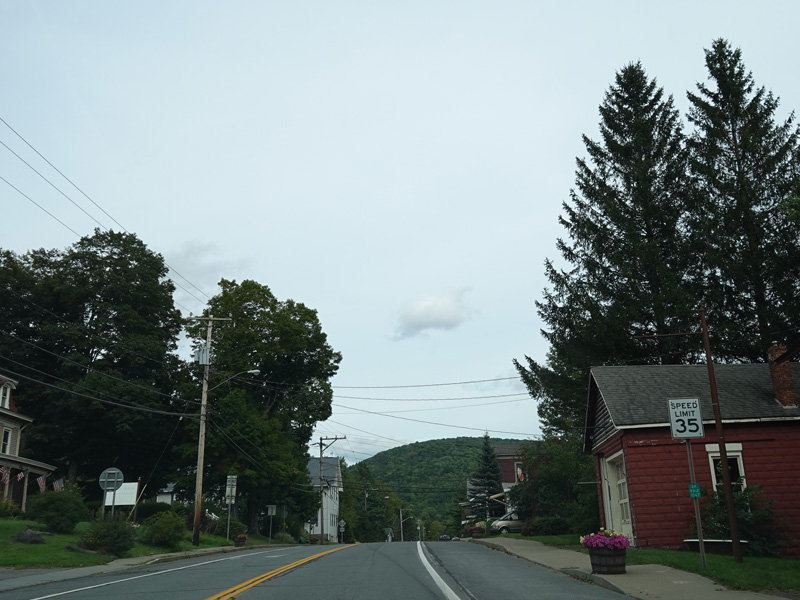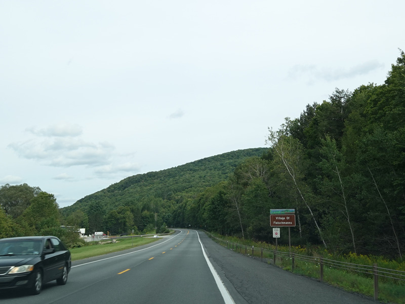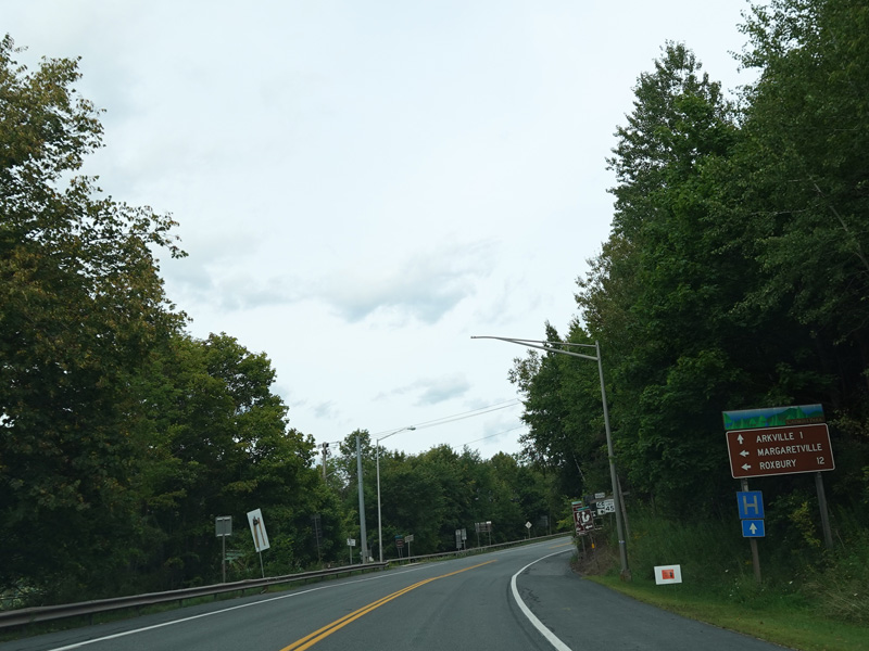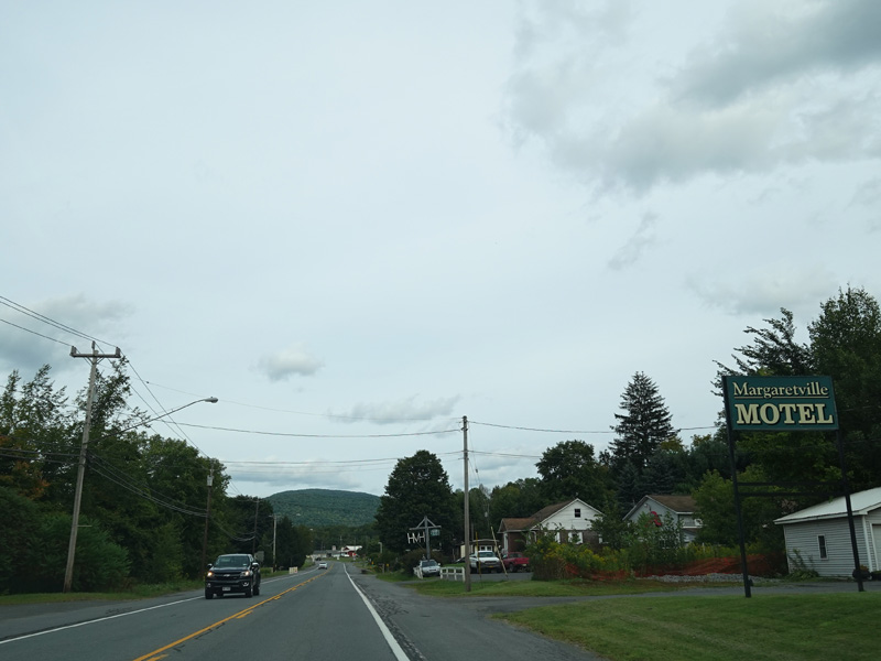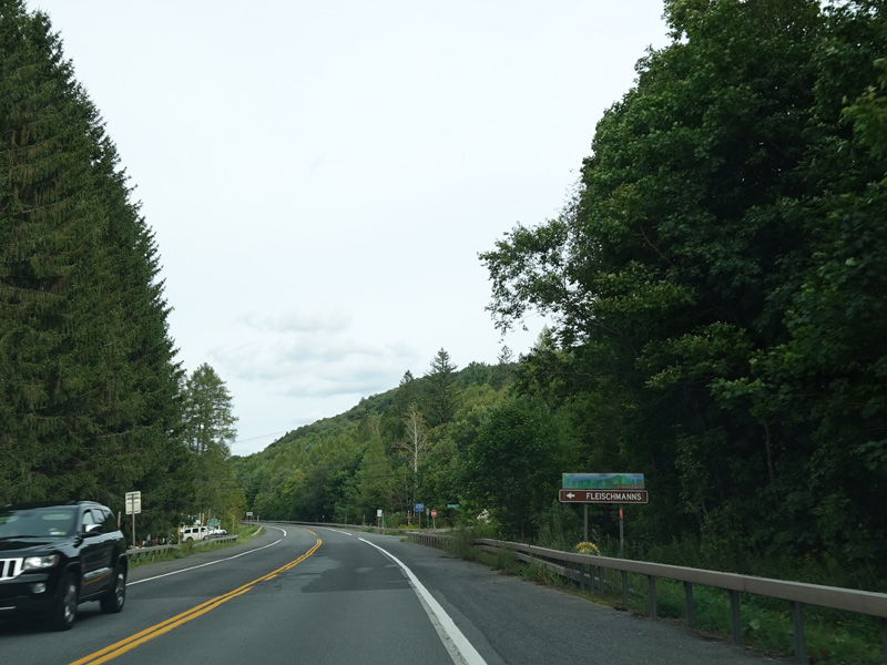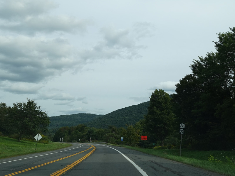 Skipping south to Margaretville, NY 28 is multiplexed with NY 30. It runs east through the mountains as a two-lane undivided road.