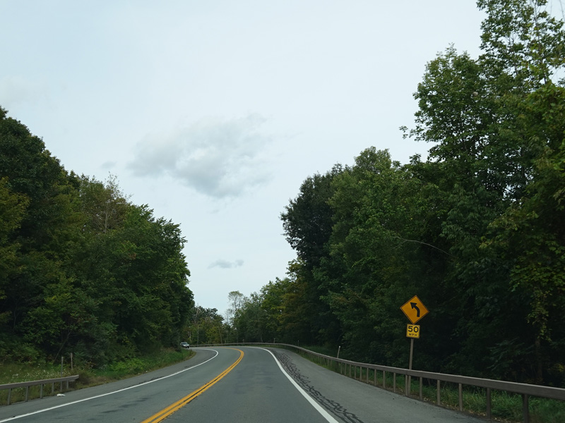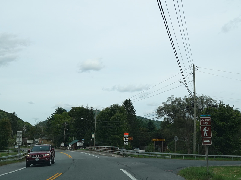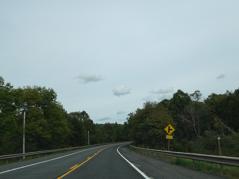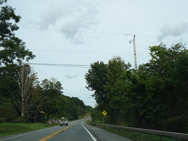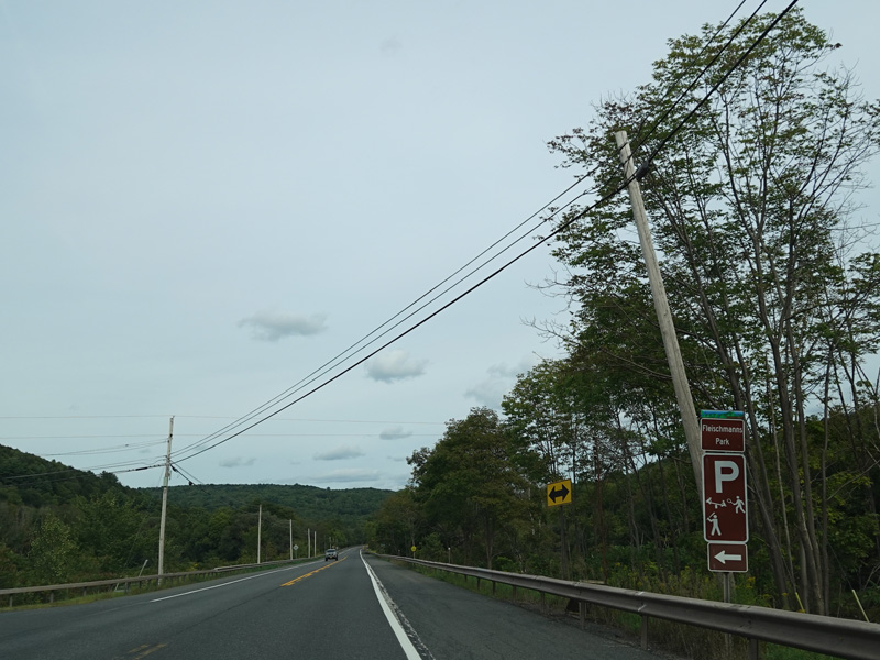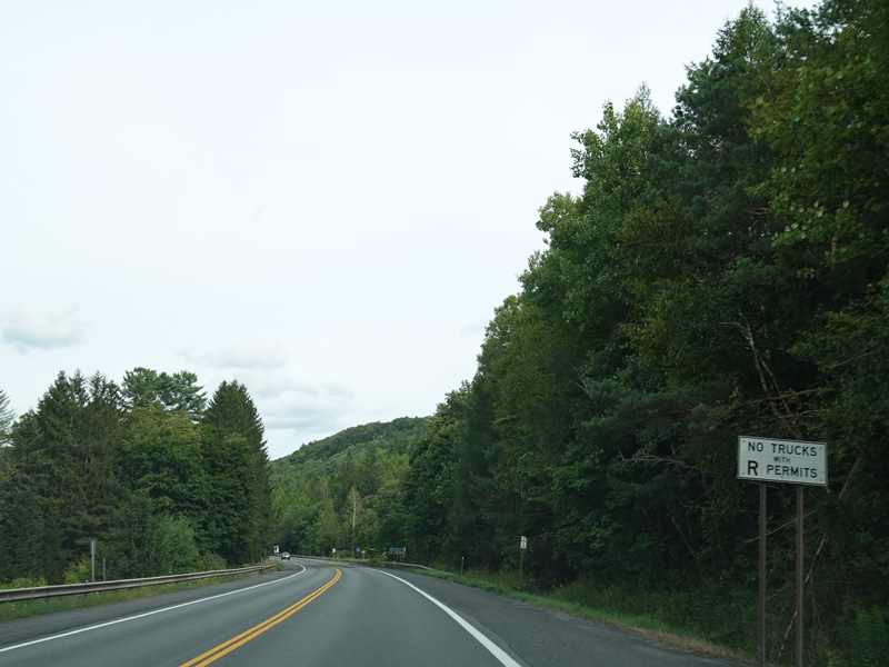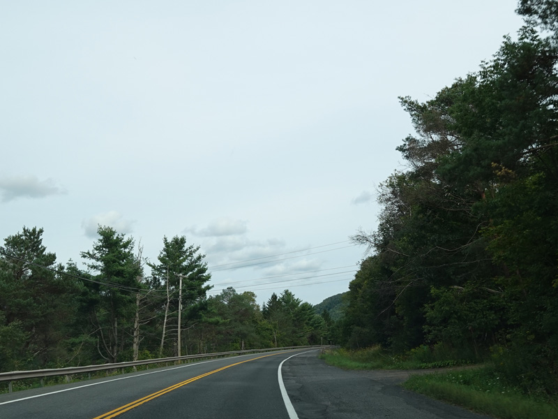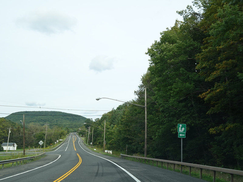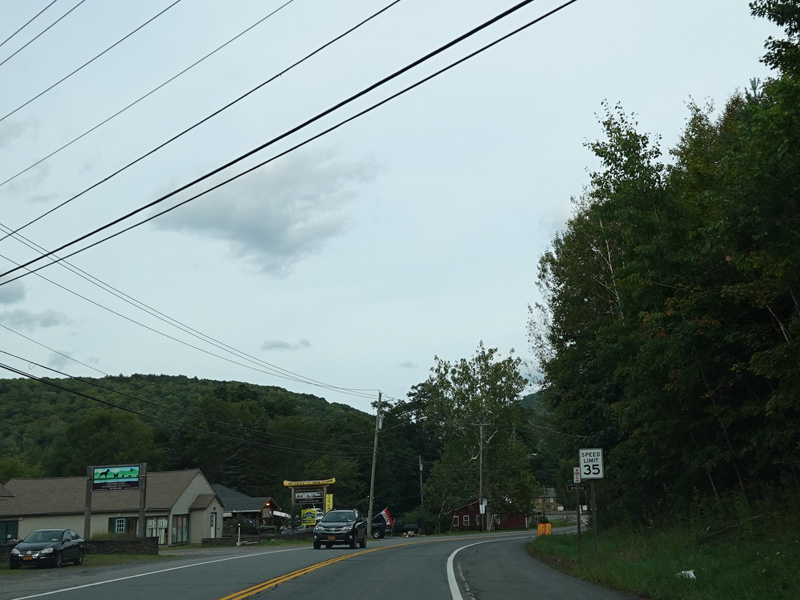 Skipping south to Margaretville, NY 28 is multiplexed with NY 30. It runs east through the mountains as a two-lane undivided road.