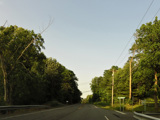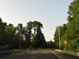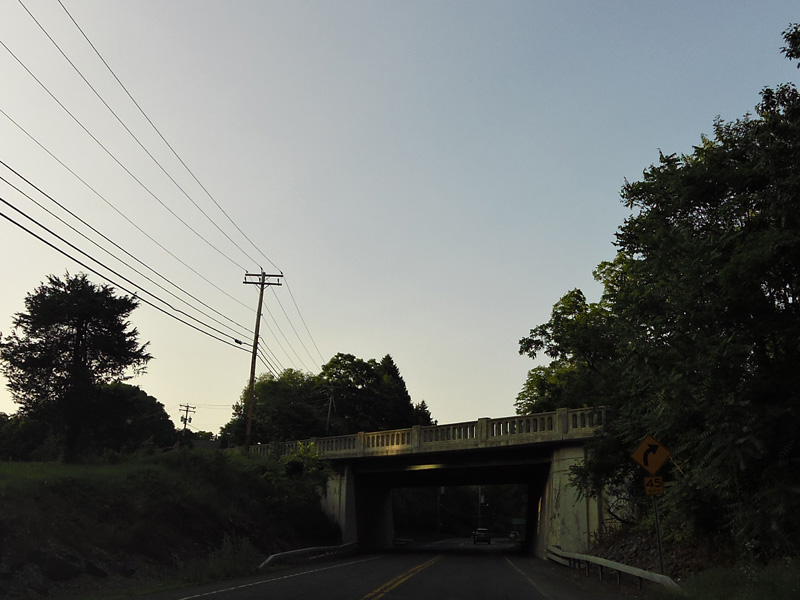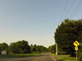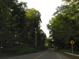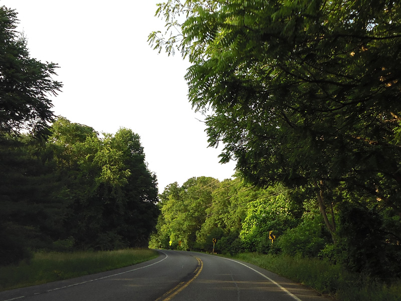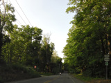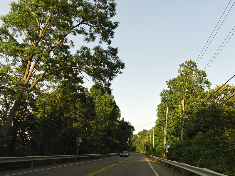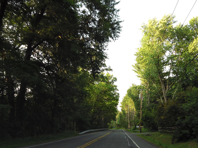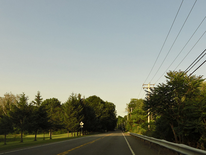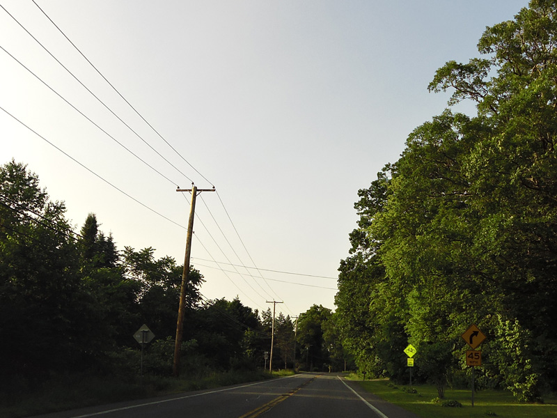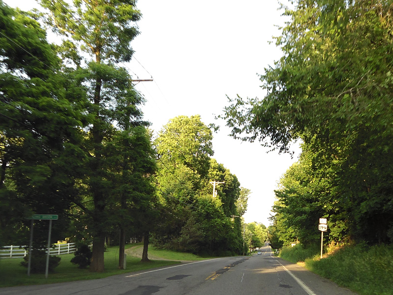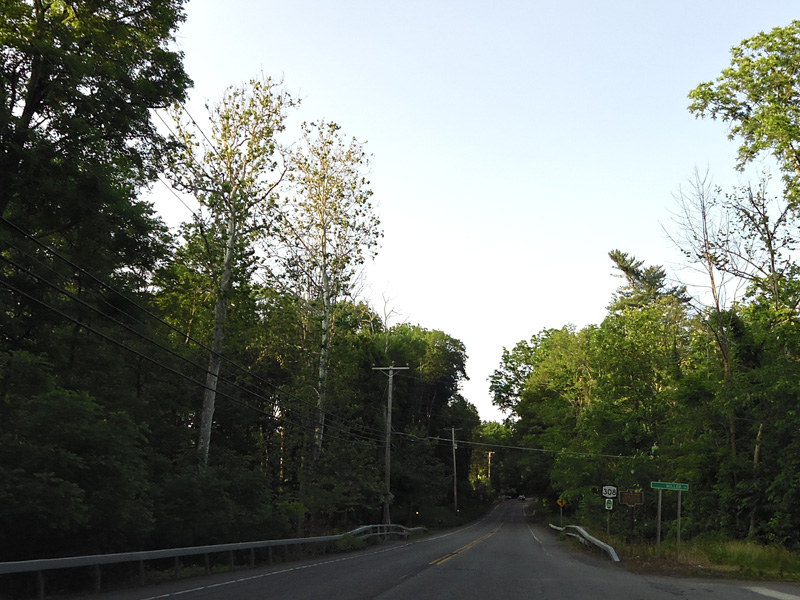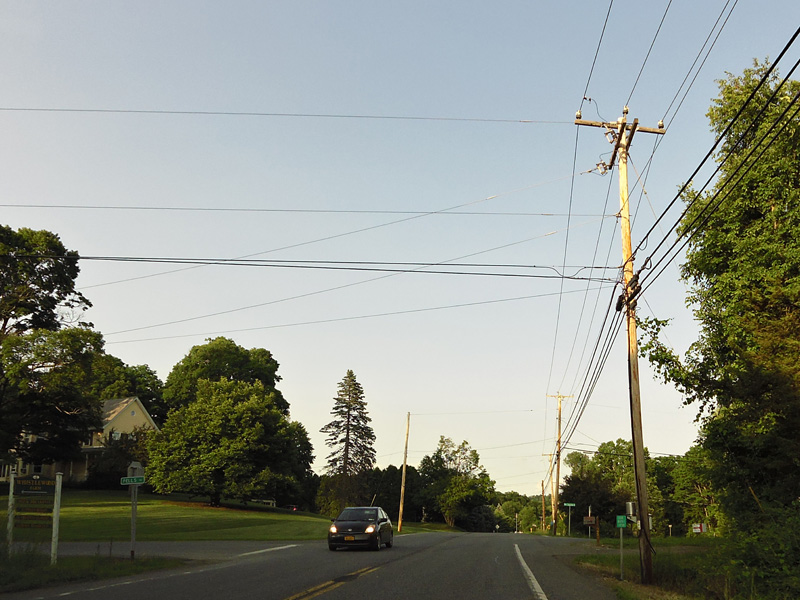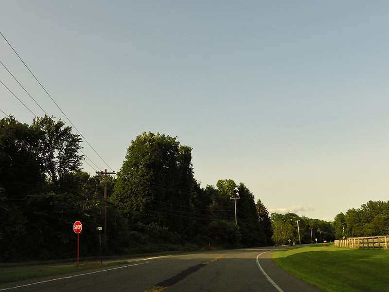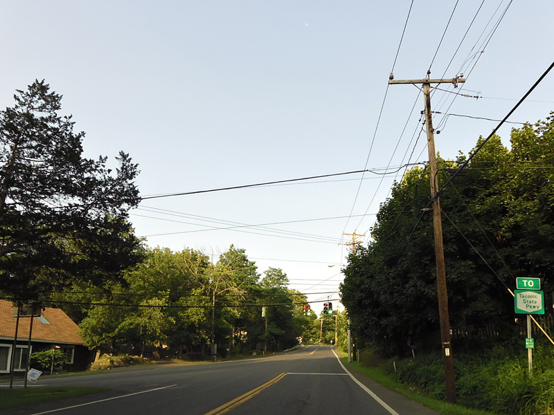 NY 308 ends here at NY 199. Turn left at the signs to go west. Merge in straight ahead at the traffic light to go east.