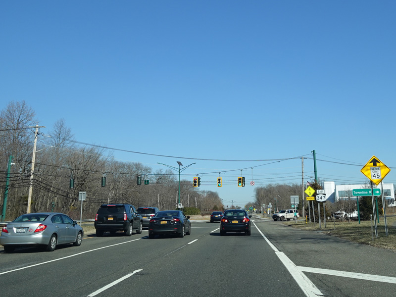 NY 347 splits off from Veterans Highway (NY 454) and runs east as Smithtown Bypass. Townline Road (CR 76) begins on the right just after the split.