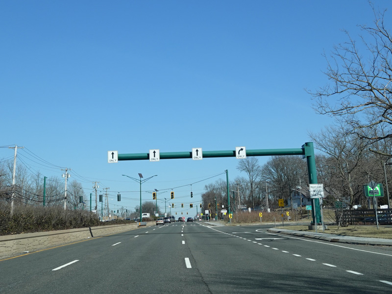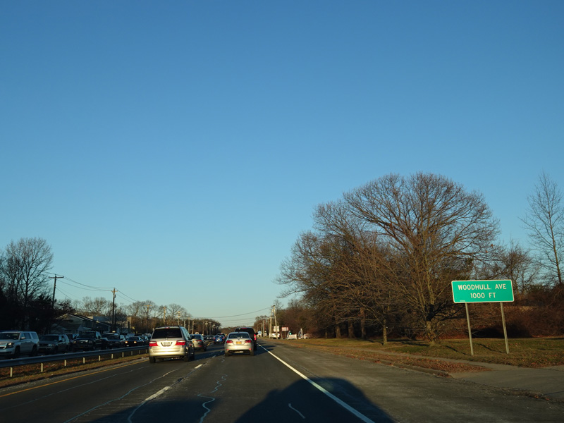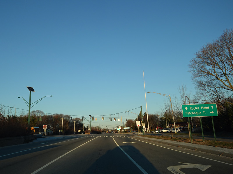 Nesconset Highway continues northeast to Port Jefferson Station. There are traffic lights at Belle Mead Road, Wireless Road, Arrowhead Lane, Old Town Road, Woodhull Avenue, and Terryville Road.