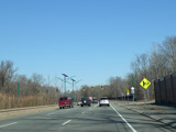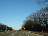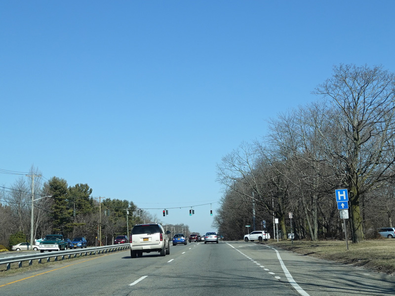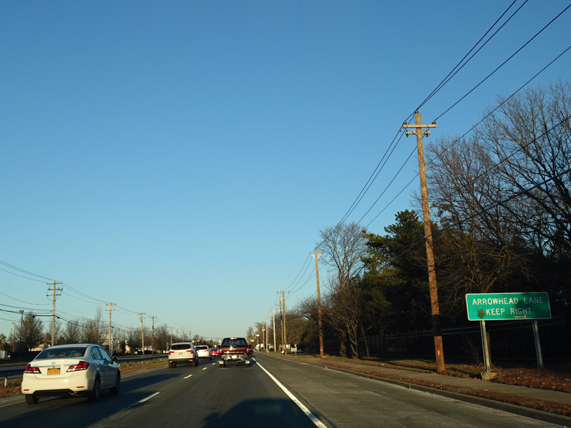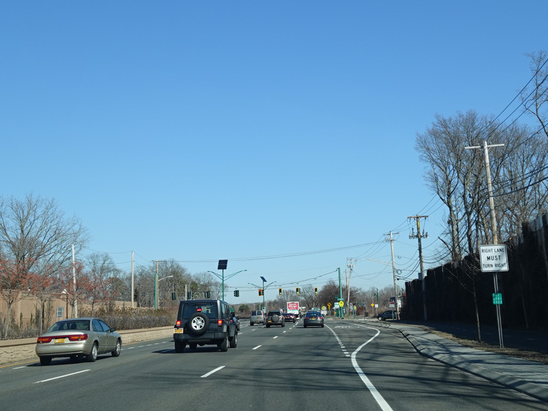 There is a traffic light at Hauppauge Road (NY 111). All vehicles bound for NY 111 must exit to the right before the light.