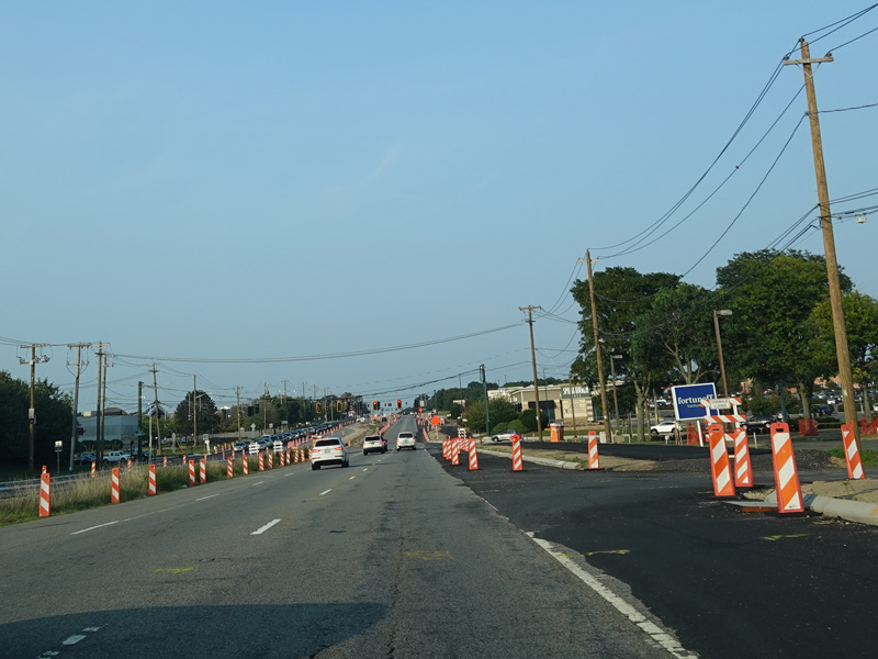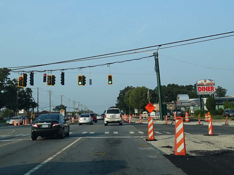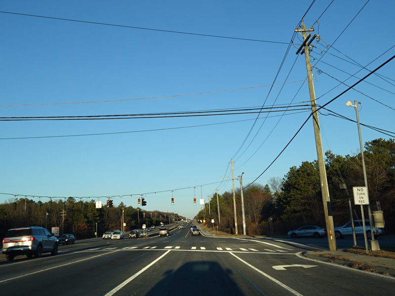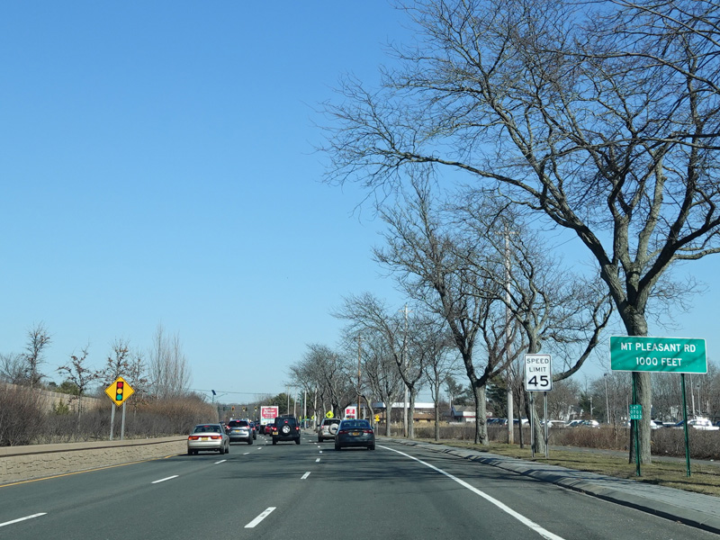 Smithtown Bypass runs to the northeast as a six-lane divided highway. There is a traffic light at Mount Pleasant Road.