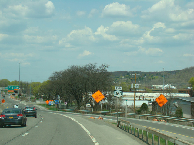 The Brandywine Highway is a short north/south expressway that extends from State Street (NY 434) in Binghamton to exit 1 of I-88. For most of its length, it is designated NY 7. However, near its southern end, NY 7 splits off onto Brandywine Avenue. The southernmost mile and change of the Brandywine Highway is designated NY 363. The designation is signed, but the most prominent signage makes reference to the other routes that can be accessed via NY 363, such as NY 7, NY 17/Future I-86, and I-81. At some interchanges, the signage makes no reference to NY 363 at all.