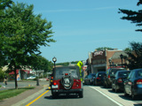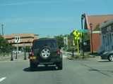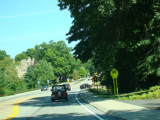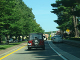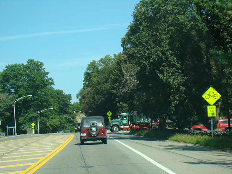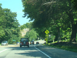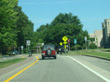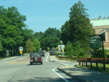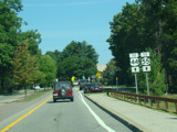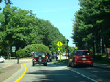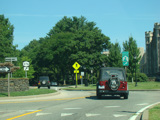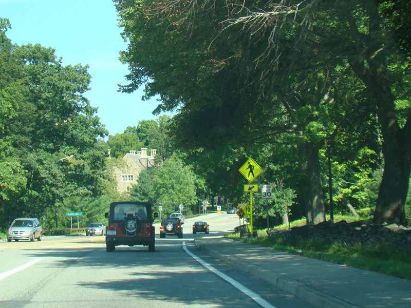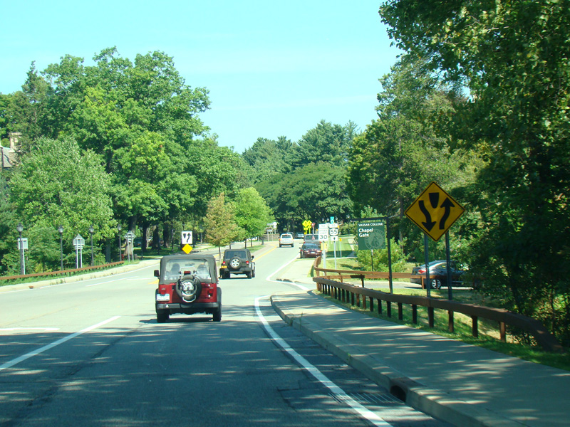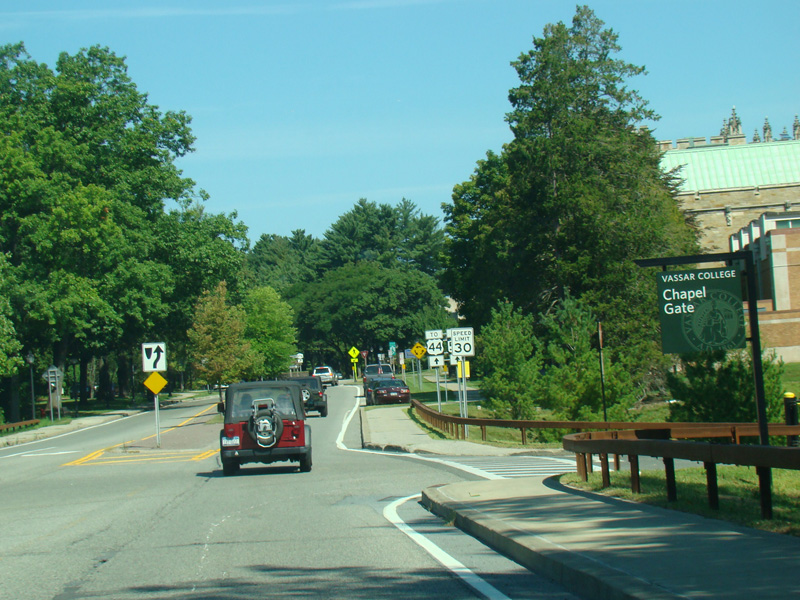 Raymond Avenue has a median with grass and trees along this stretch. There are three traffic circles. The campus of Vassar College is to the right.