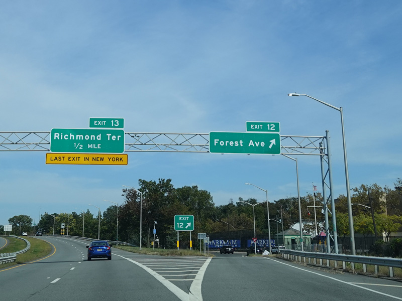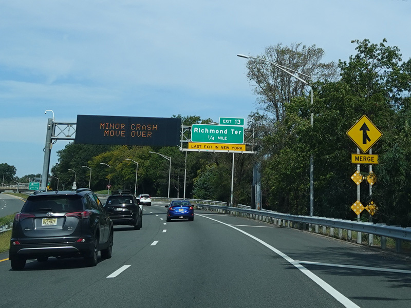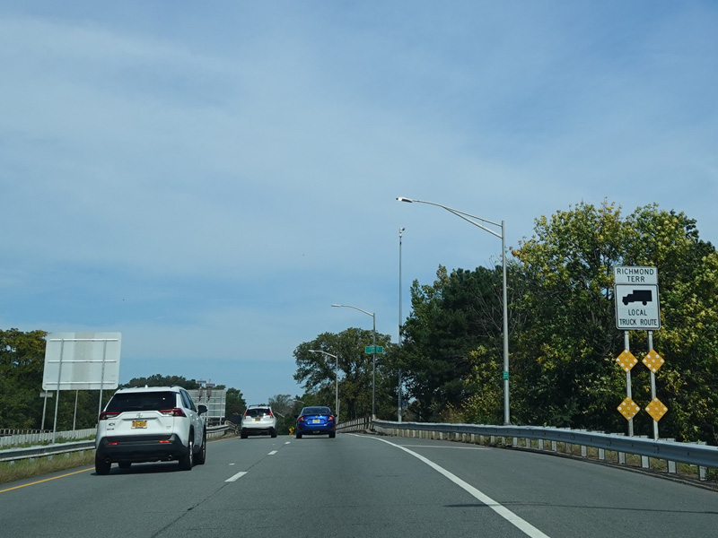 Exit 13 is for Richmond Terrace. There is a cashless tolling gantry for southbound traffic, but there is no toll when travelling in this direction. Straight ahead, the Bayonne Bridge crosses the Kill Van Kull to Bayonne, New Jersey. NY 440 becomes NJ 440 at the state line.