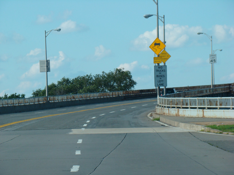 These pictures show the approach to the Bayonne Bridge as it appeared before the roadway was raised. At the time, there was a tollbooth instead of a cashless tolling gantry, and the roadway on the bridge was undivided.