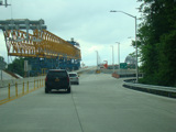 These pictures show the approach to the Bayonne Bridge as it appeared while construction work was in progress to raise the roadway on the bridge. At the time, the bridge was narrowed down to two lanes.