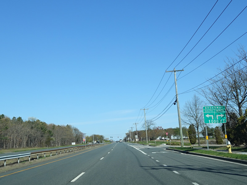 Veterans Highway begins at Sunrise Highway (NY 27) and runs northwest as a four-lane divided highway. There is a traffic light at Broadway Avenue.