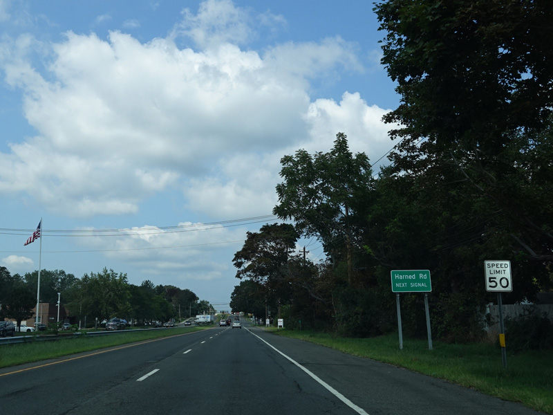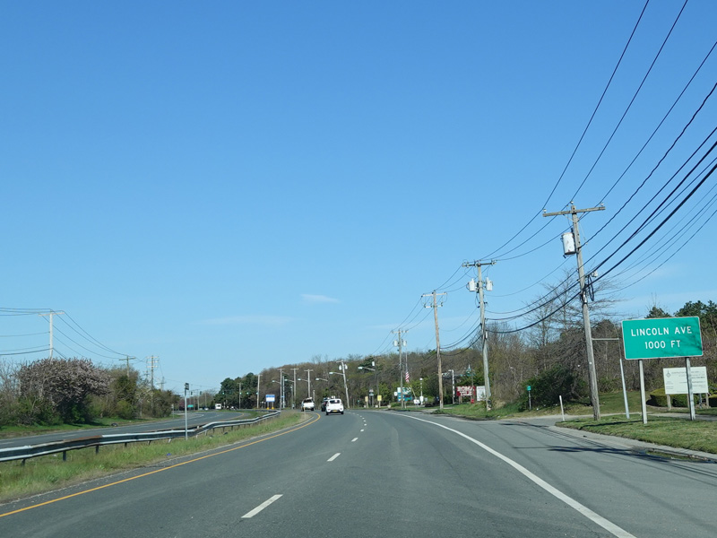 Veterans Highway continues northwest as a four-lane divided highway. There are traffic lights at Lincoln Avenue, Wyandanch Boulevard, and Harned Road.