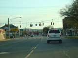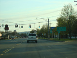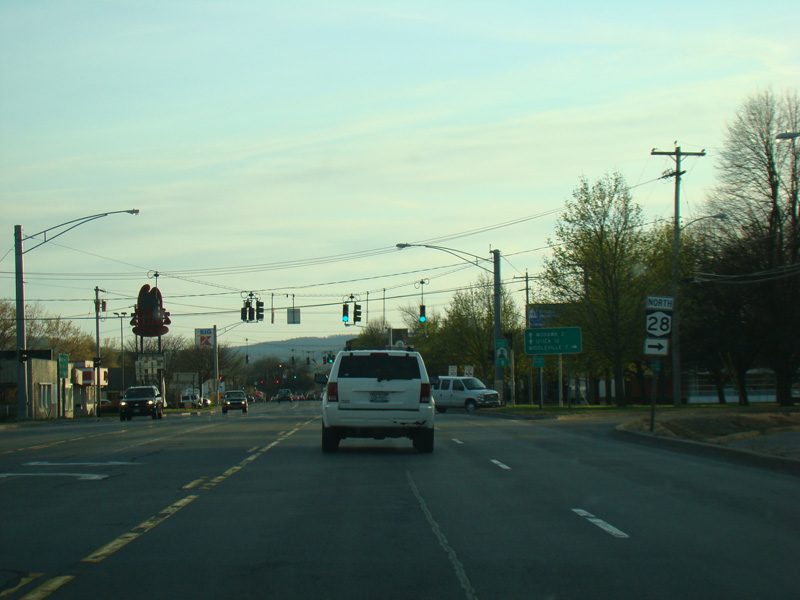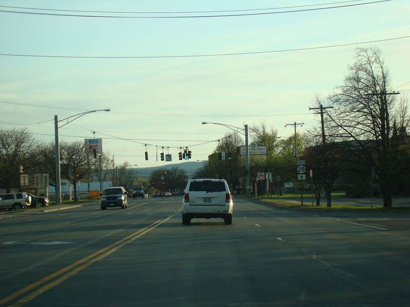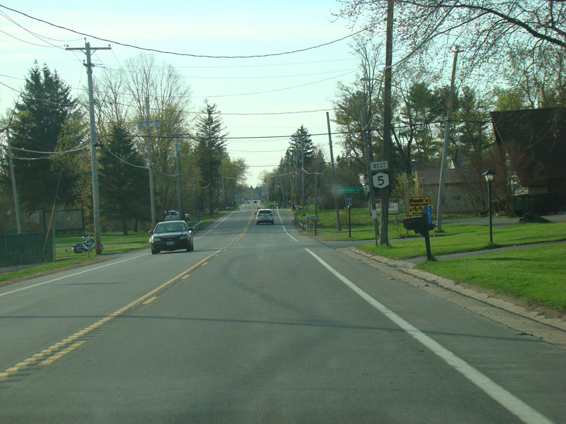 Middleville Road (NY 28) begins on the right at this traffic light. Turn right here to go north. Southbound NY 28 is multiplexed with NY 5 straight ahead.