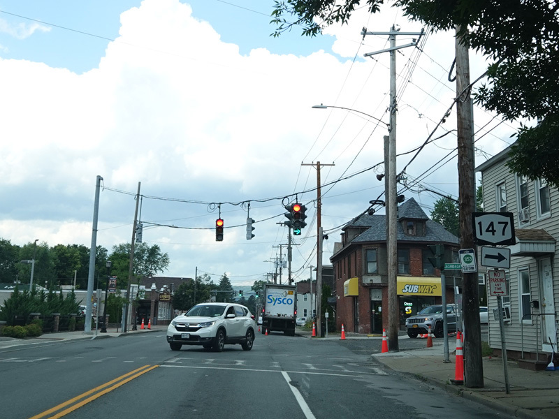 Sacandaga Road (NY 147) begins on the right at a traffic light.
