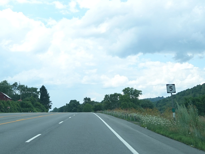 Approaching the county line, NY 5 becomes a divided highway again, with the westbound lanes elevated relative to the eastbound lanes.