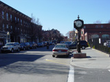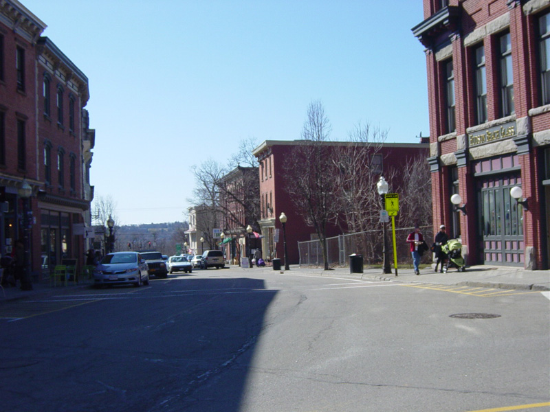 Main Street ends here at NY 9D. Turn left onto Wolcott Avenue to go south. Turn right onto North Avenue to go north and to continue west on Business NY 52.