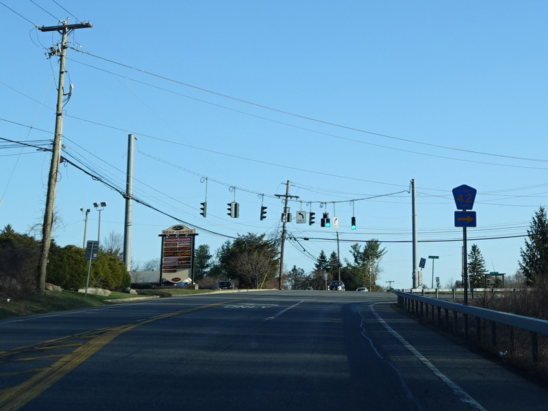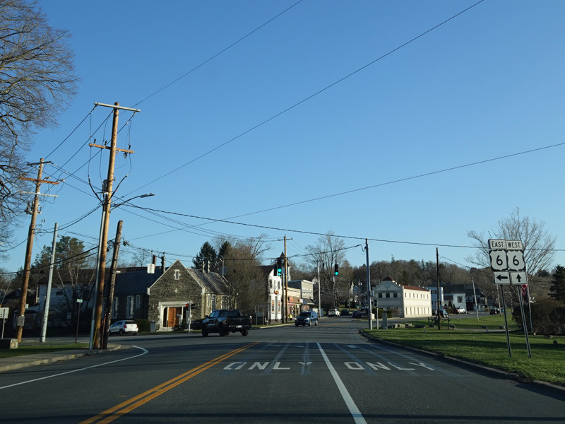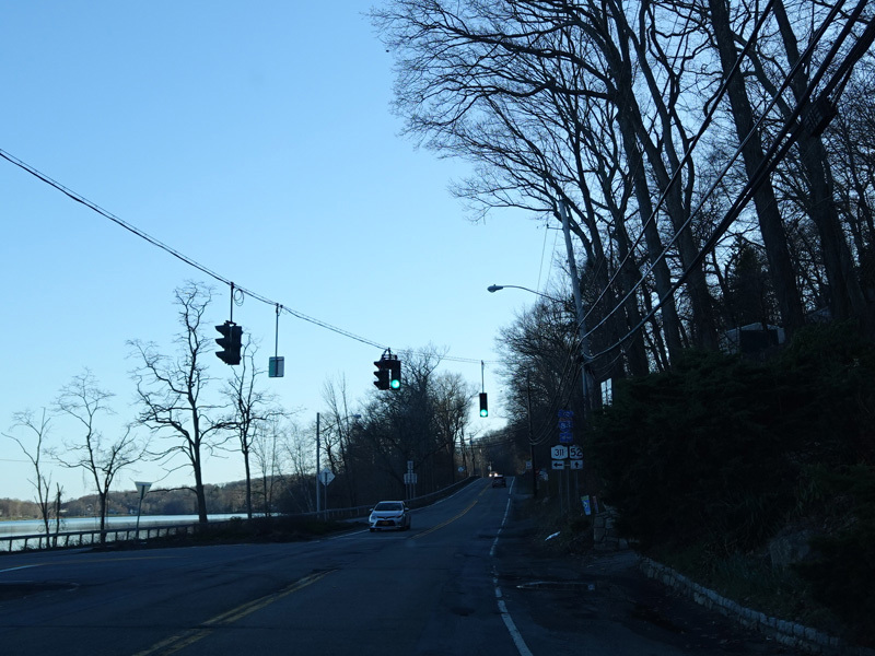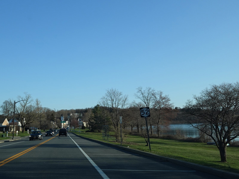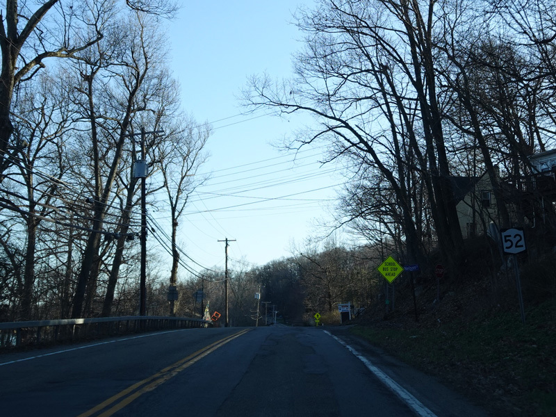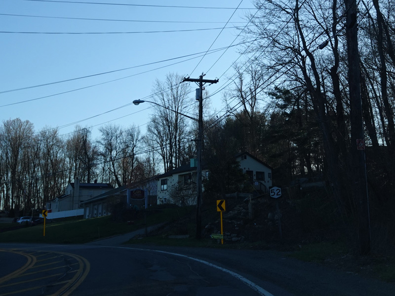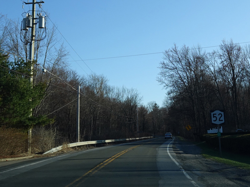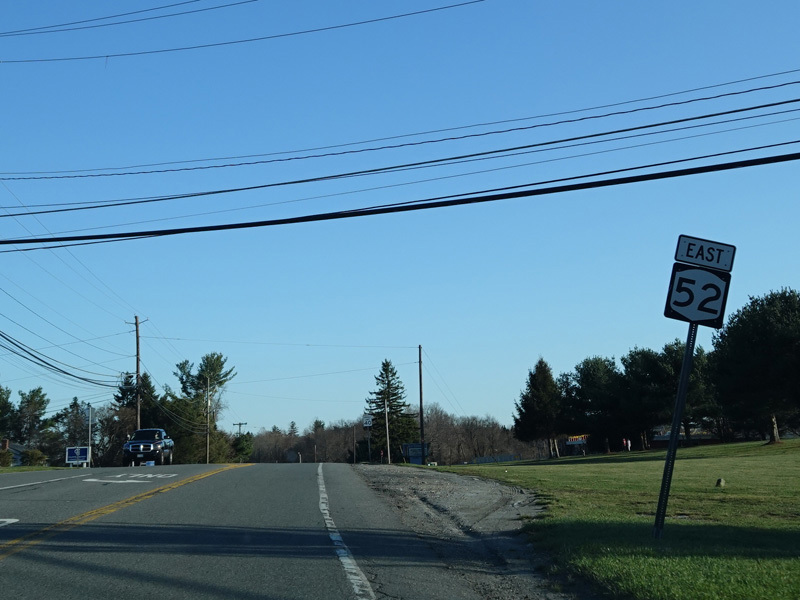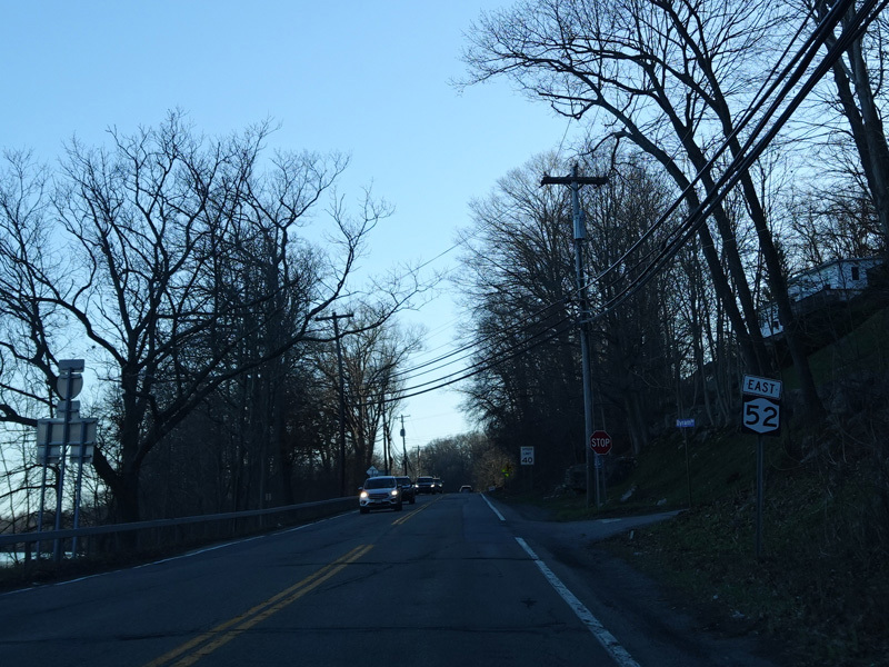 NY 52 ends here at a traffic light at US 6. Turn left to go east or continue straight ahead to go west. There is an erroneous NY 6 shield here.