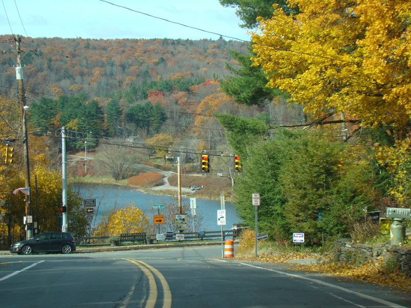 There is a traffic light at Lake Street. NY 55 splits off to the left here.