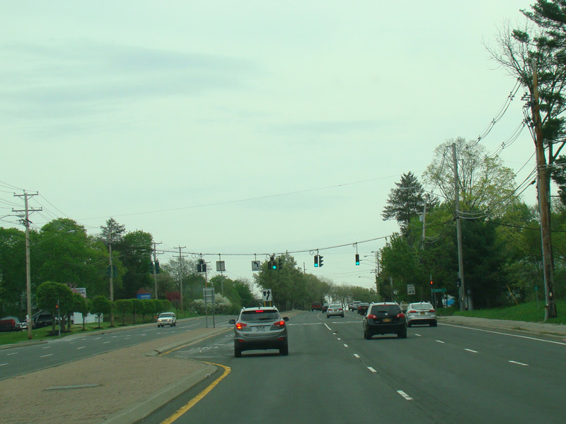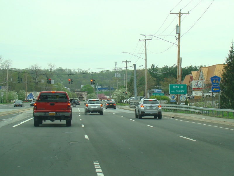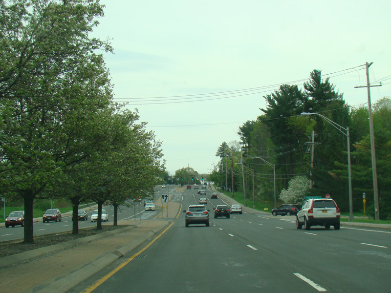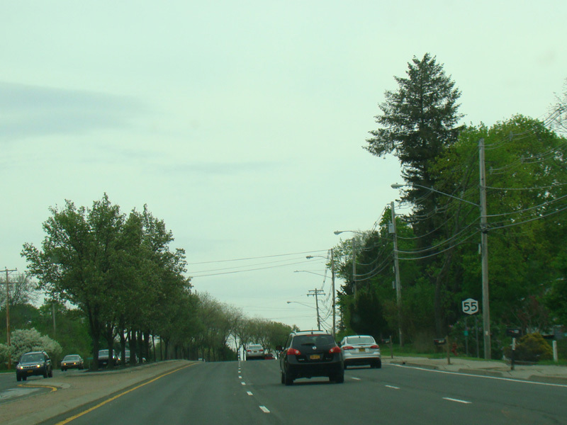 Skipping many miles to the east, NY 55 splits off from US 44 to become a six-lane divided highway called Freedom Plains Road.
